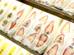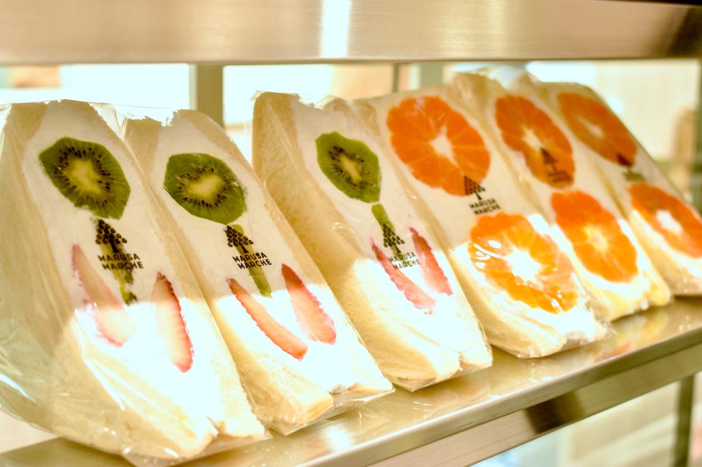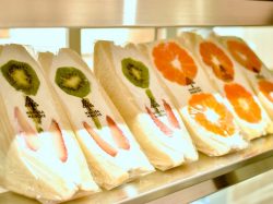 カラフルなフルーツサンドがショーケースぎっしりに並ぶ。新鮮なフルーツがごろっと入ったフルーツサンドはクリームが甘すぎず食べやすい。見た目も可愛らしいおはなサンドは写真映えすると若者から大人気。