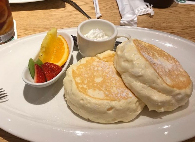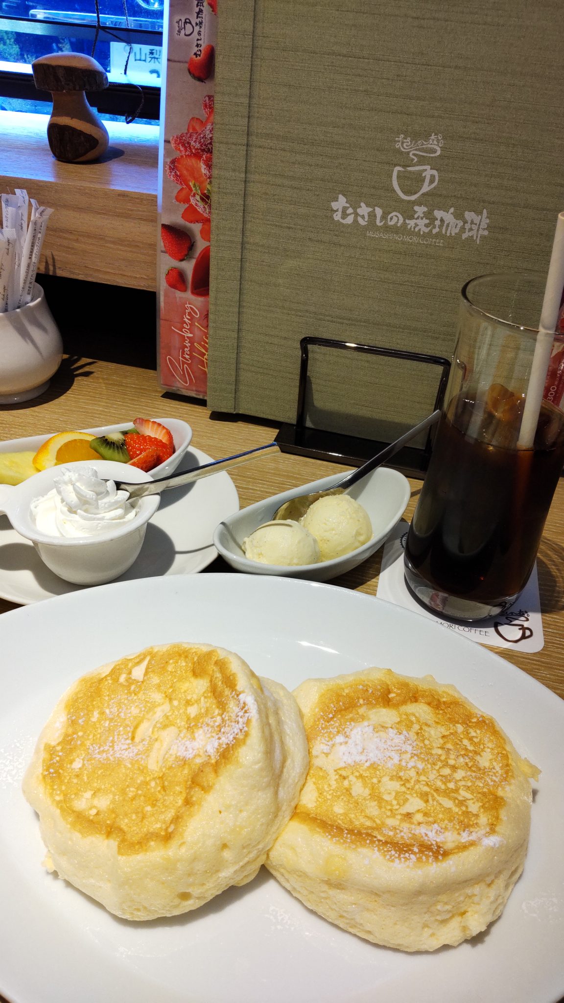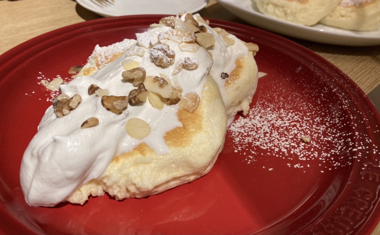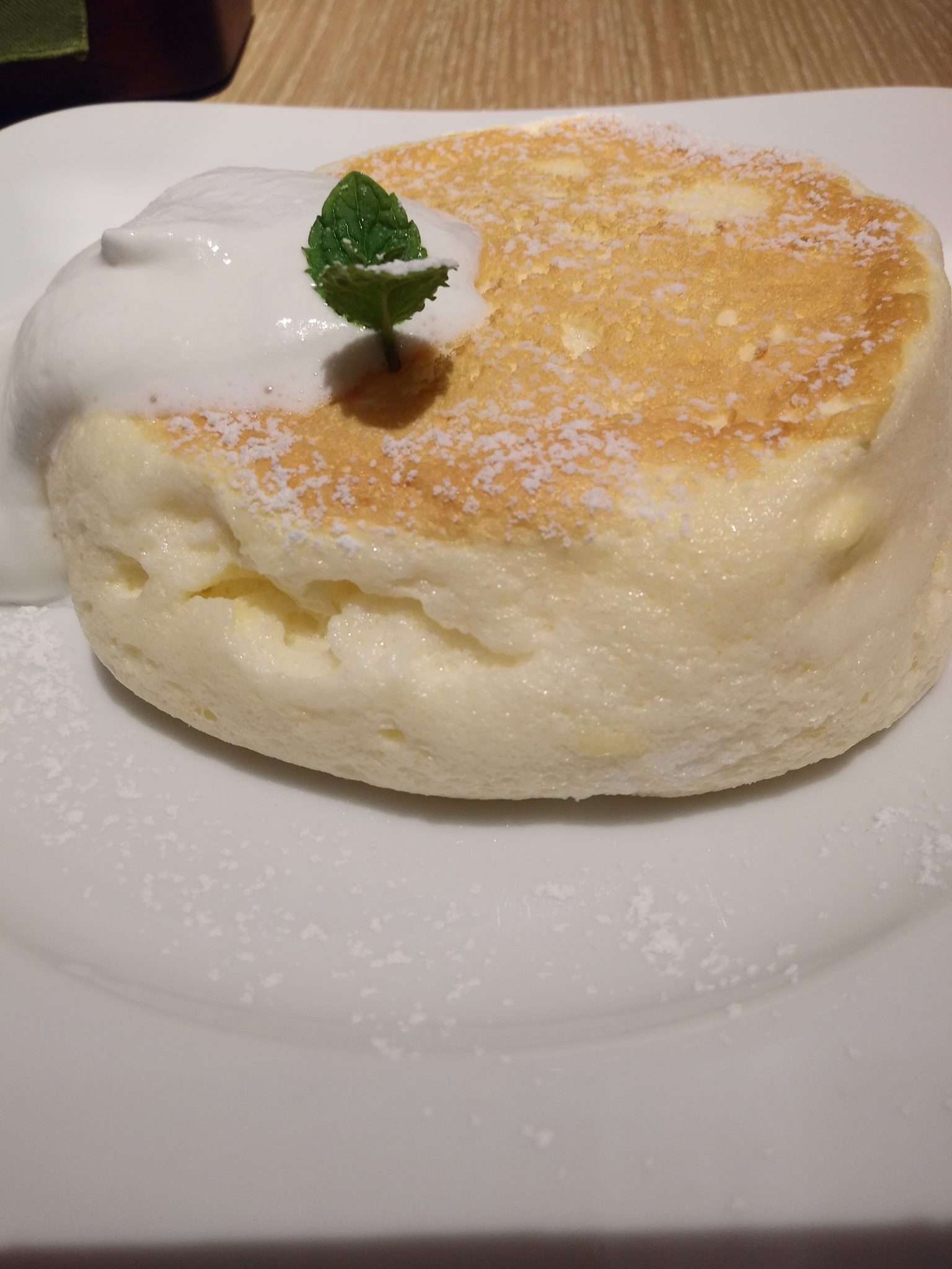 パンケーキはふわとろパンケーキにいくつかトッピングにしました。シロップは味が濃いので、パンケーキそのままで食べるかホイップと食べるのが、パンケーキの味を楽しめました🎵時間がたってもフワトロのままで美味しく食べられました!