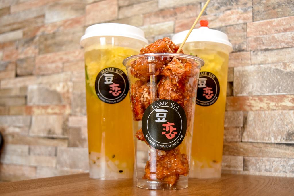 ・豆恋黒糖紅茶タピオカミルクティー M510円 L570円 ・フルーツティー L600円~ ・豆恋 カフェモカチョコレートフラッペ M580円 ・自家製 芋園 豆花 700円 ・甘辛ヤンニョムチキン カップ560円 ・韓国チーズボール S330円 M450円 L650円 ※全て税込 |