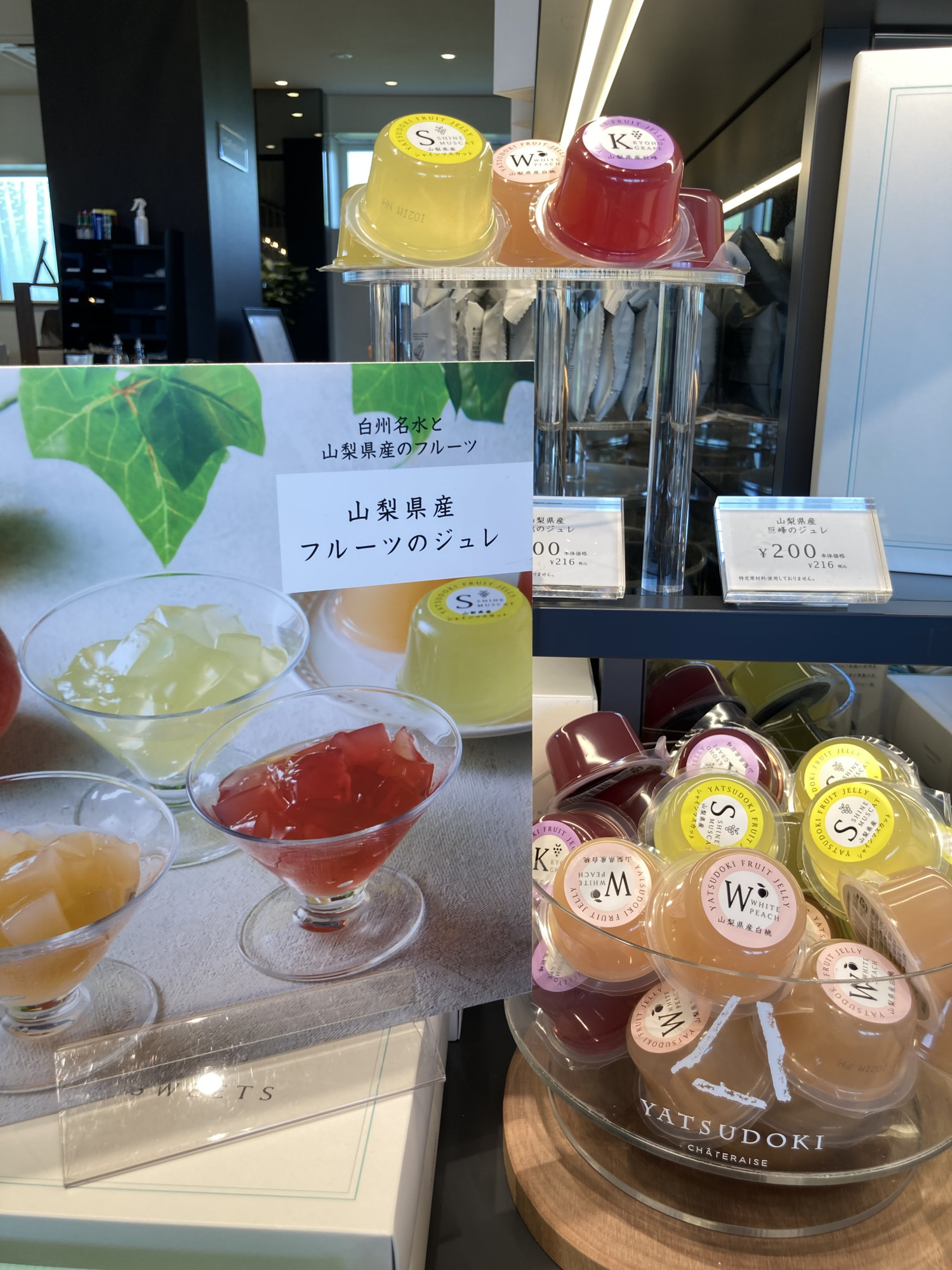白州名水と、山梨名産の桃、巨峰にシャインマスカットを使用したジュレに。