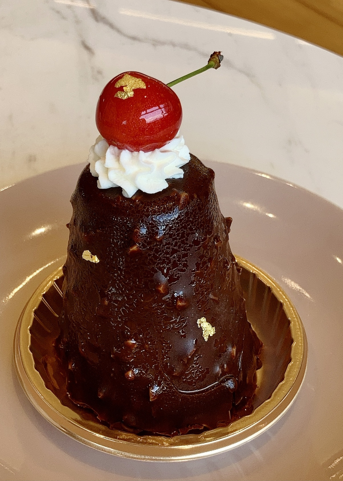ムースの中には、酸味のあるグリオットチェリーのソース。それをナッツ入りのチョコレートでコーティングした、大人な装いのケーキです。もちろんトップには新鮮なさくらんぼ。