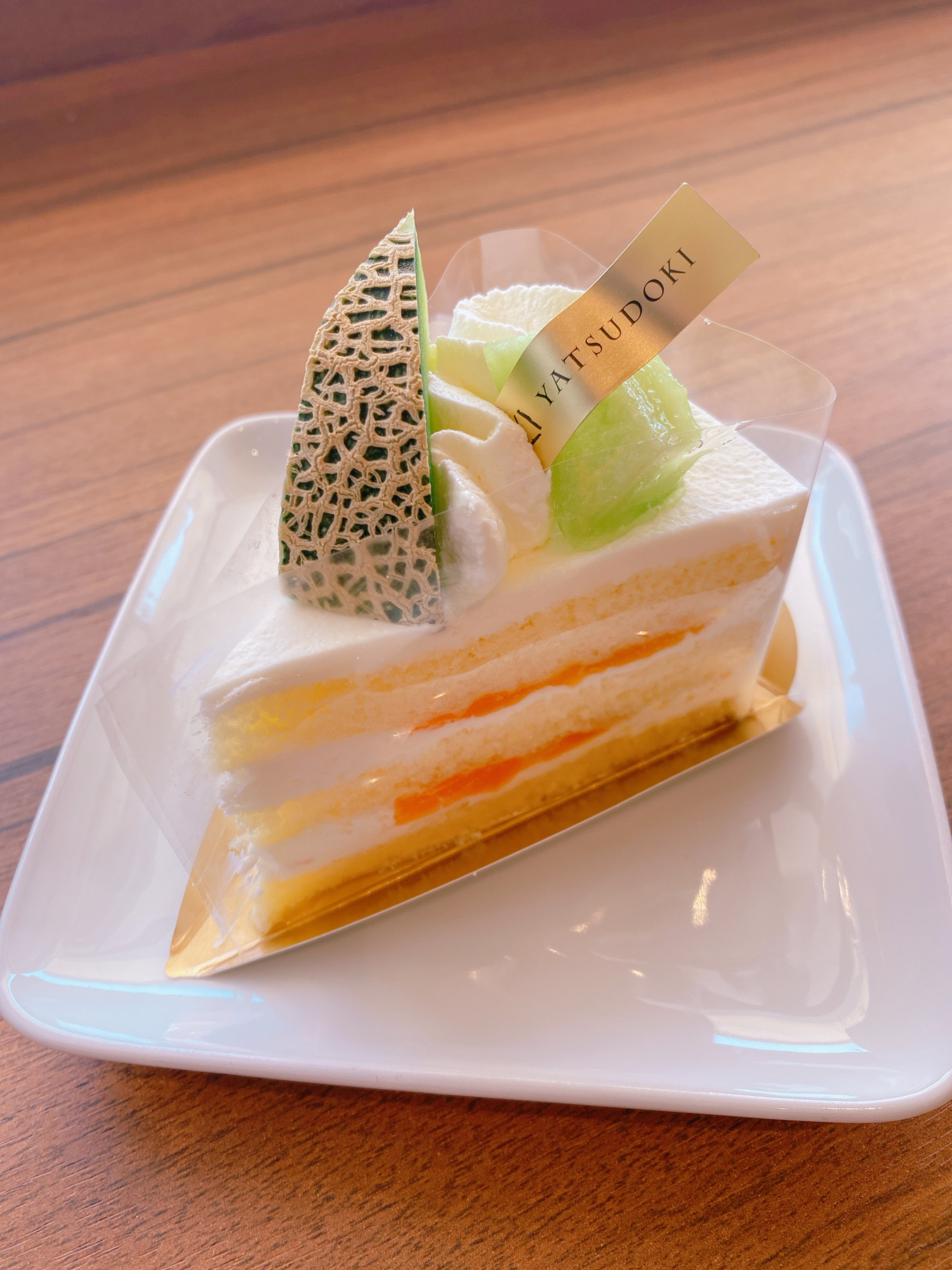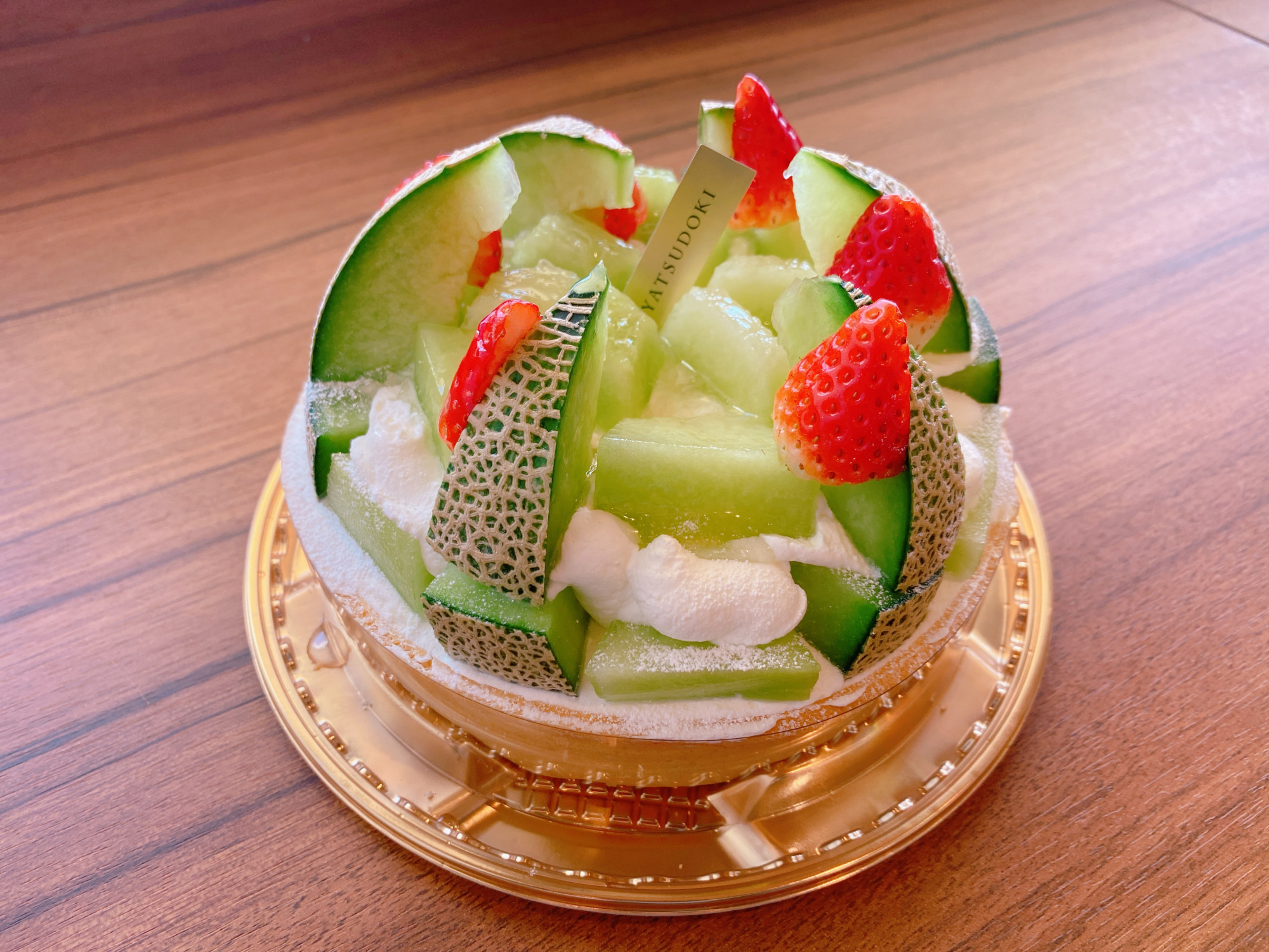 メロンフェスタ始まりました。まずは定番のショートケーキをご紹介! 赤肉メロンを挟んだ生地に旬のメロンを飾りました。
