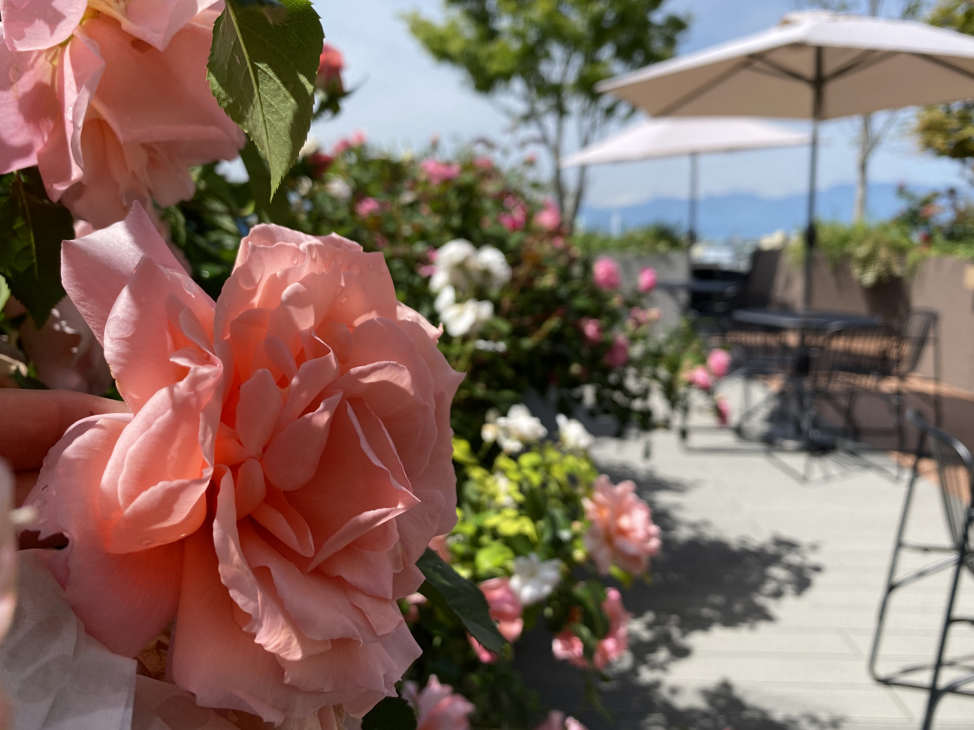 ガーデンテラスにたくさんの薔薇🌹が咲き始めました。心地よい風の中、笛吹の山々と笛吹川を眺めながら、ケーキを堪能してください。この時期ならではのガーデンテラスでお待ちしております。