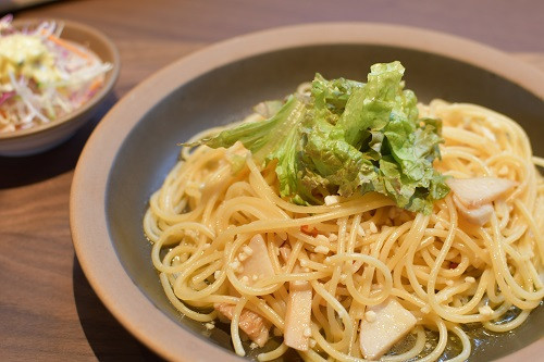 コリコリとした食感が特徴の「はくれい茸」とフレッシュな「水菜」のシャキシャキとした食感が楽しめるパスタです。 -