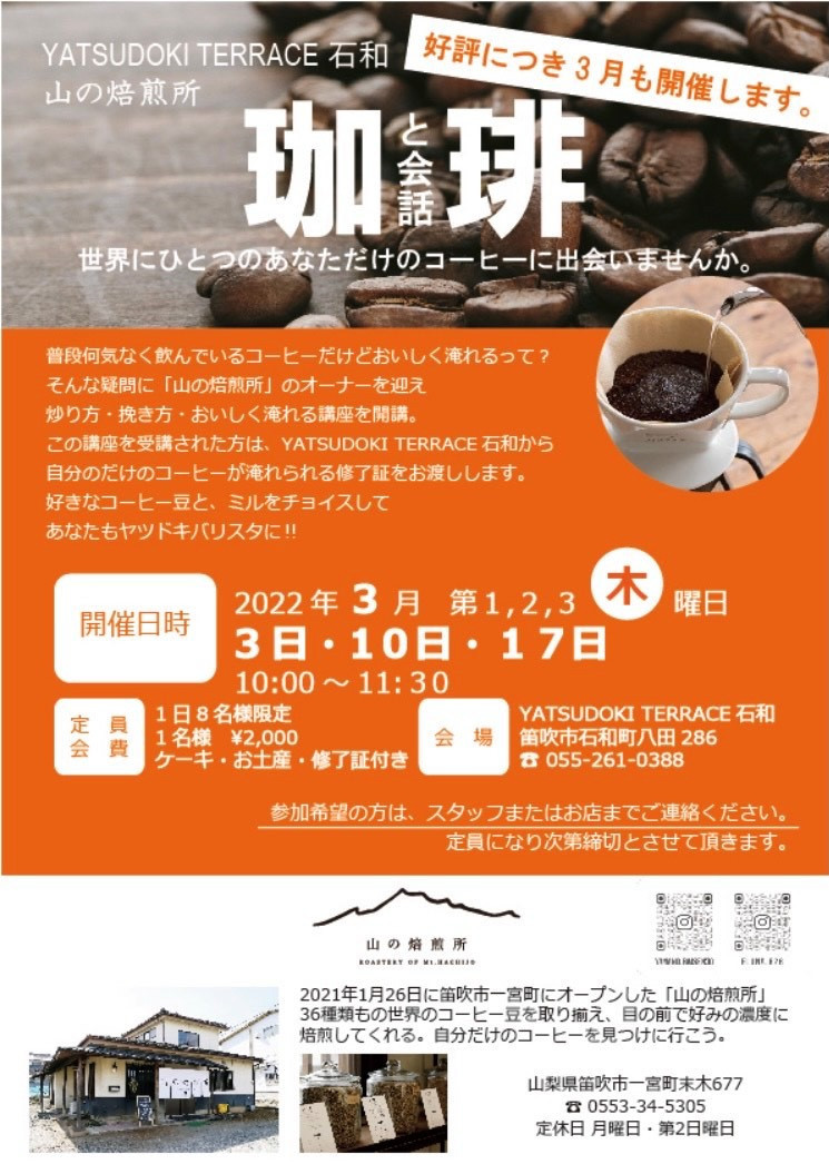 2月に開催されます講座講座は、好評につき満席となりました。 そこで、3月の3日・10日・17日いずれも木曜日に、再講座を開設しました。 TERRACE石和にて「珈琲と会話」と題しコーヒーの講座を開... -