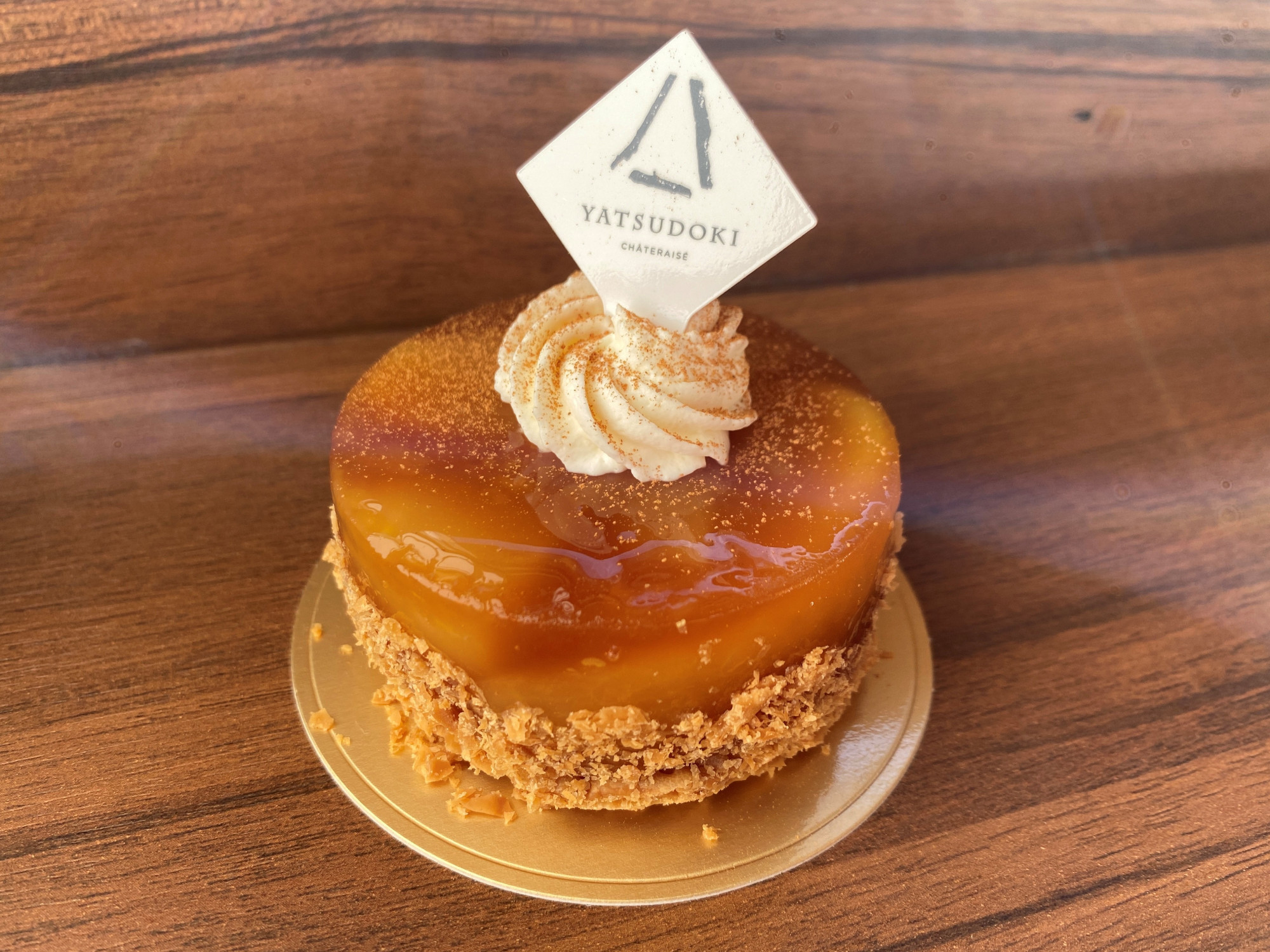 「タルトタタン」リンゴのキャラメリゼと山梨県産柚子果汁を使用した酸味のあるジュレで覆い、中にはカスタード生を絞り、表面には生クリーム、シナモンパウダーを振りかけました、キャラメリゼの甘味ほろ苦さを感じ... -