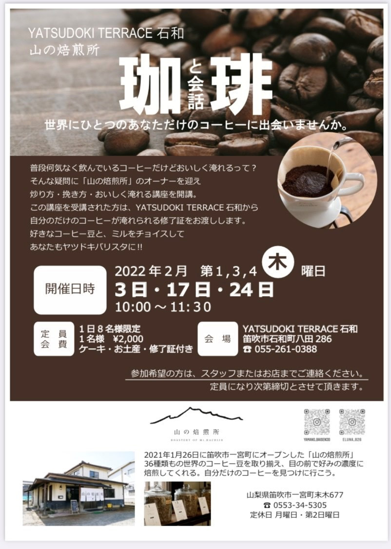 2月の3日・17日・24日いずれも木曜日。TERRACE石和にて「珈琲と会話」と題しコーヒーの講座を開きます。 コーヒー豆の選びかた、挽き方、淹れ方を教えてもらい、自分だけのコーヒーを淹れちゃおう☕... -