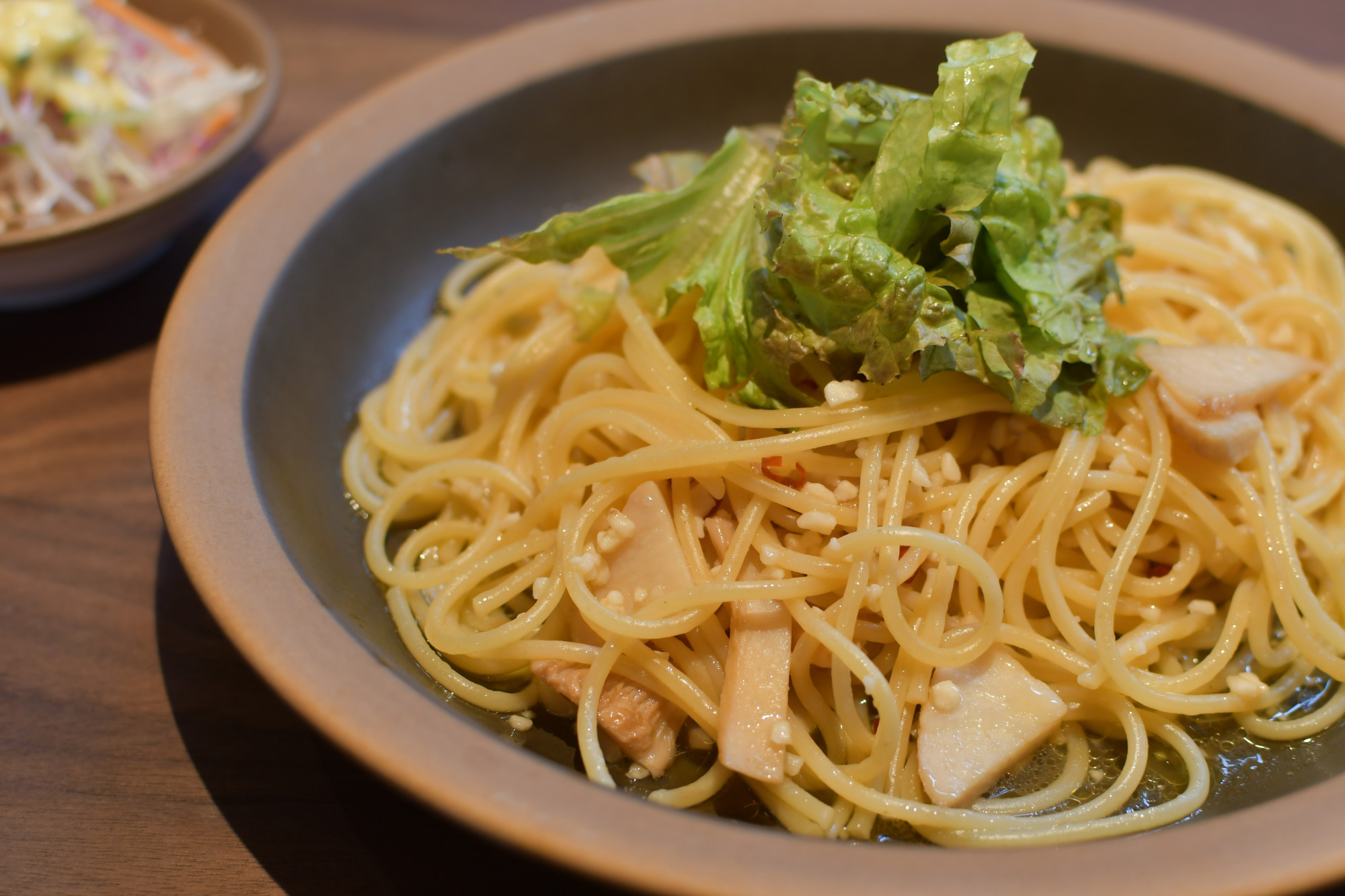 「YATSUDOKI TERRACE石和」自慢のランチをどうぞ。 今回ご紹介は「有坂きのこ園のはくれい茸と水菜のアーリオオーリオ」税込990円 コリコリとした食感が特徴の「はくれい茸」とフレッ...