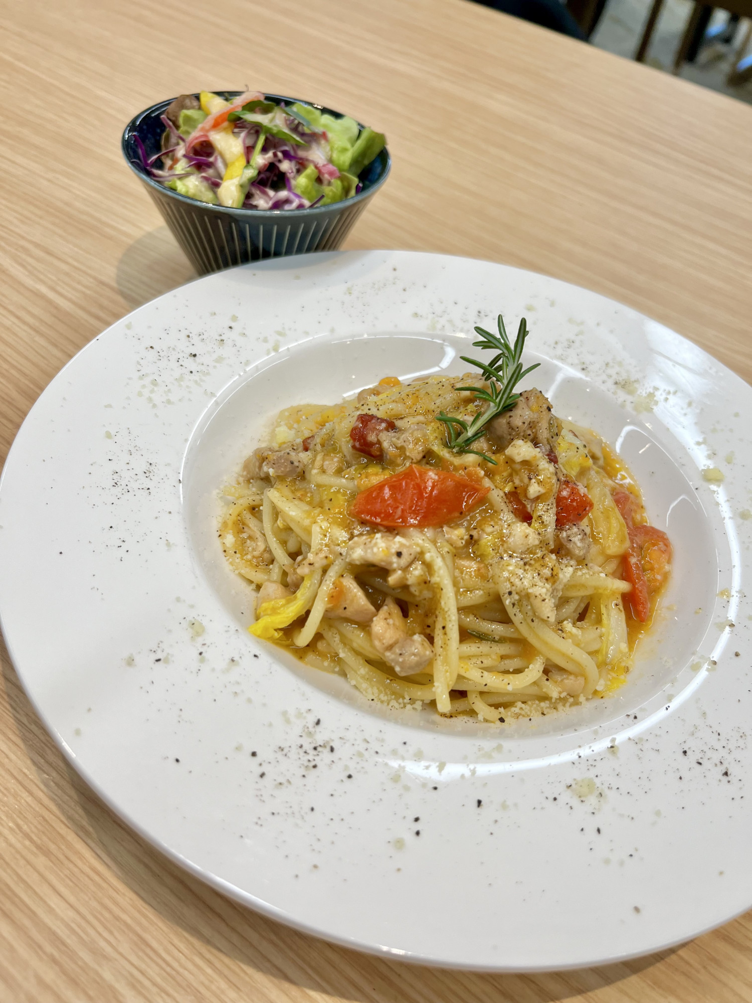 信玄鶏と黄芯白菜のフレッシュトマトのパスタ