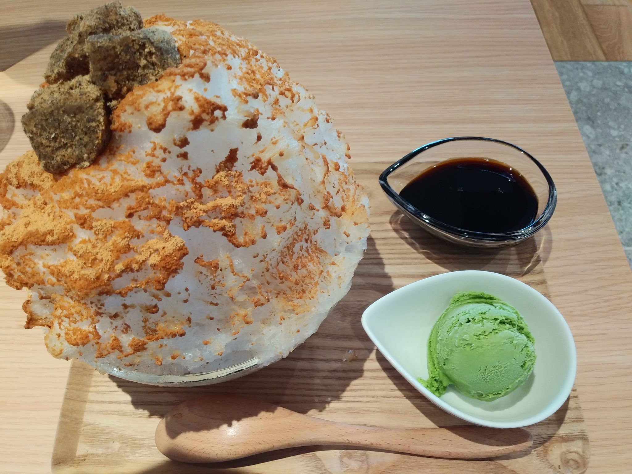 天然氷使用のかき氷を食べました。中にはたっぷりの小豆、きな粉にわらび餅がトッピングされていました。お好みで黒蜜をかけて。別添えの抹茶アイスが濃厚で、とても美味しかったです。けっこうボリュームがあり、身体のクールダウンになりました。