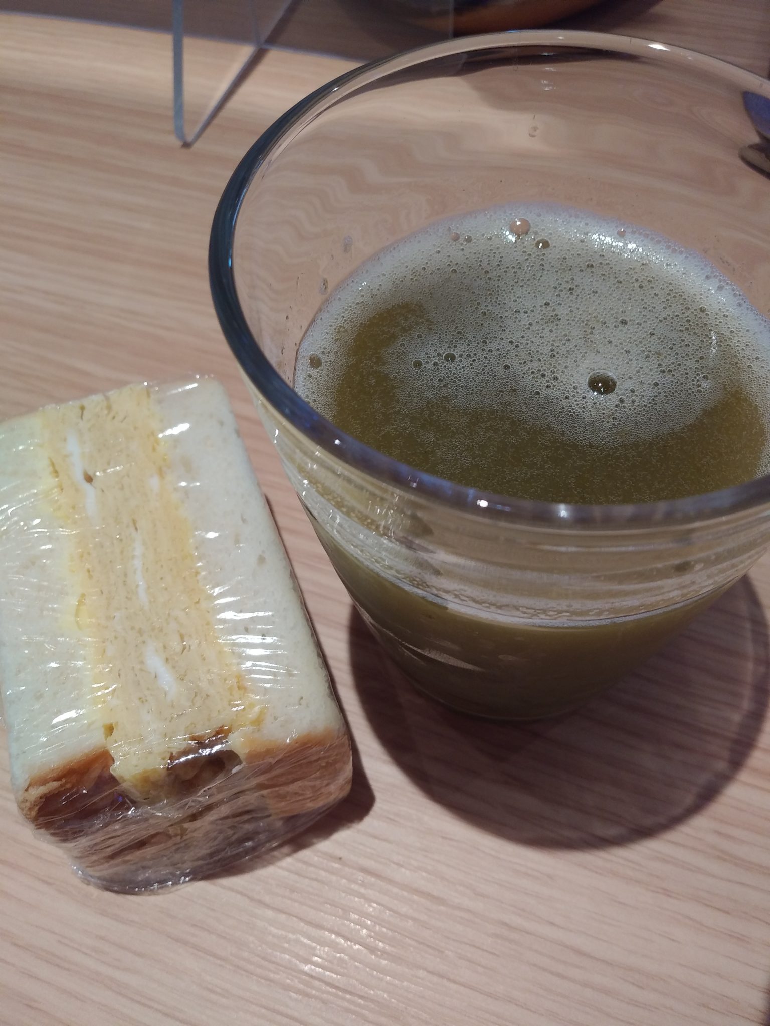 富士野屋特製の玉子焼きがサンドされた「玉子サンド」と、セットのドリンクはスムージーです。焼き立ての熱い玉子焼きではなく、冷蔵保存されていた玉子焼きサンドで、想像と違っていましたが、甘めで美味しい玉子焼きでした。スムージーは店内でパックに入って販売されているので、購入も可能です。おやつにちょうど良かったです。