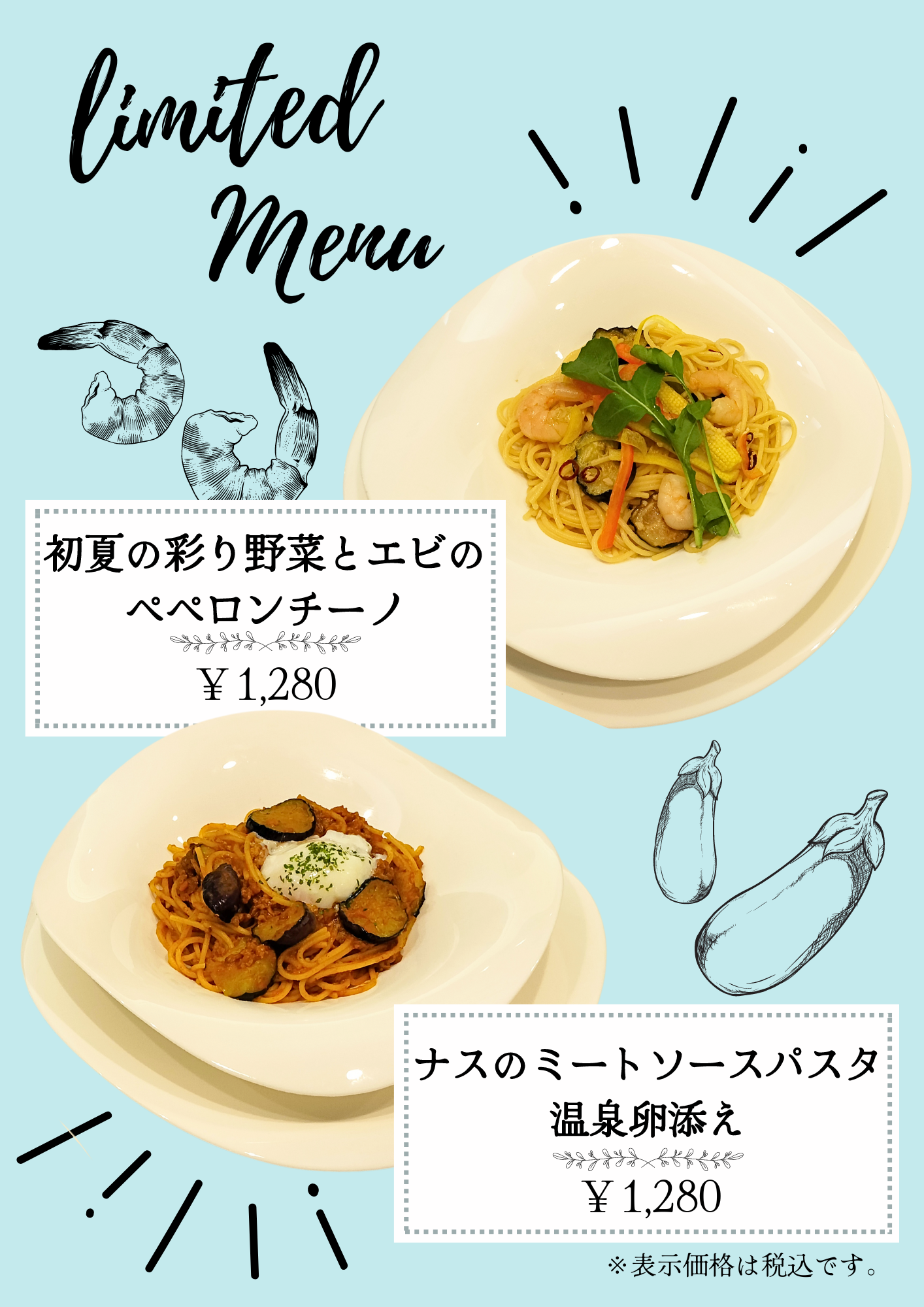 \✨期間限定メニュー出来ました✨ / 🍽初夏の彩り野菜とエビのペペロンチーノ 1,280円(税込) 🍽ナスのミートソースパスタ 温泉卵添え 1,280円(税込) 来週6/24(月)か...