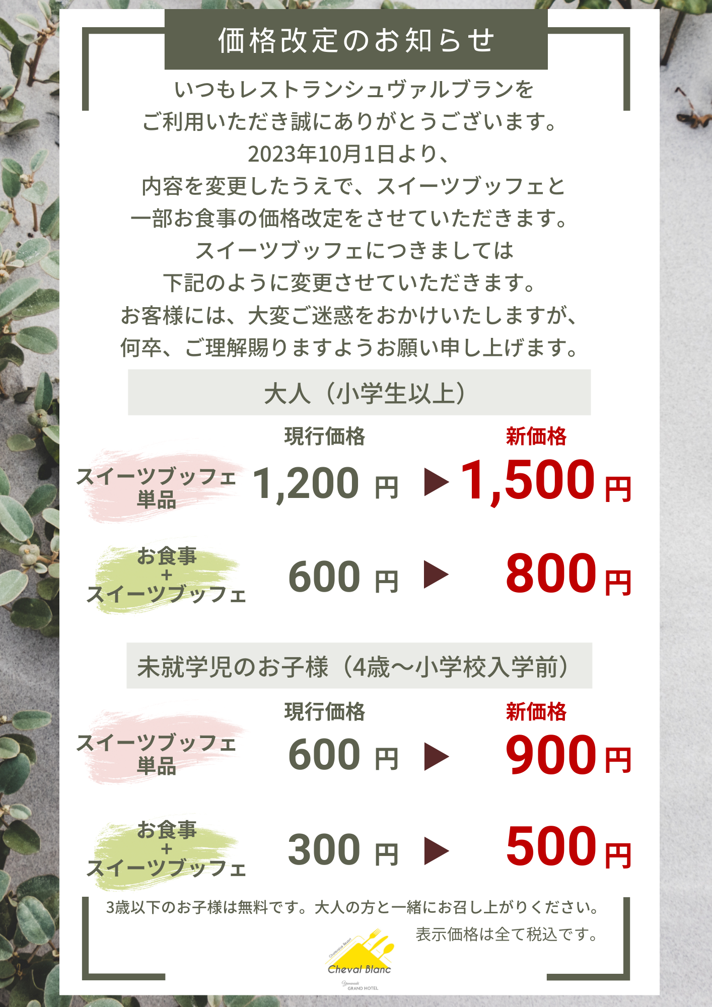 2023年10月1日から原材料高騰に伴い、一部のお食事とスイーツブッフェの価格改定を実施させていただくこととなりました。