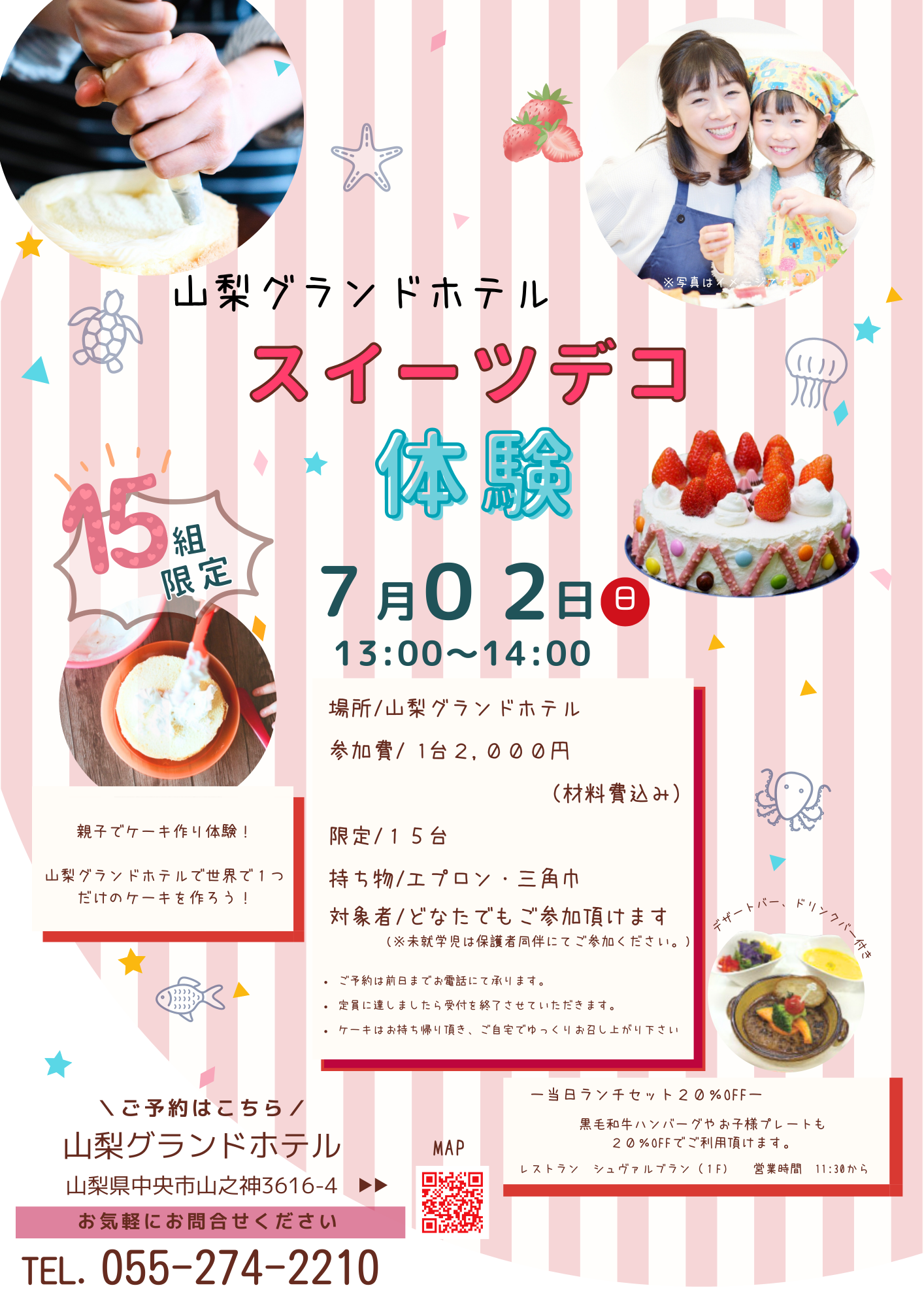 山梨グランドホテルにて   ❤🍰🍓スイーツデコ体験🍓🍰❤ イベント開催します! ケーキ作り、おうちではなかなか準備も大変ですよね! シャトレーゼのレストランで世界に一つだけの オリジナル...
