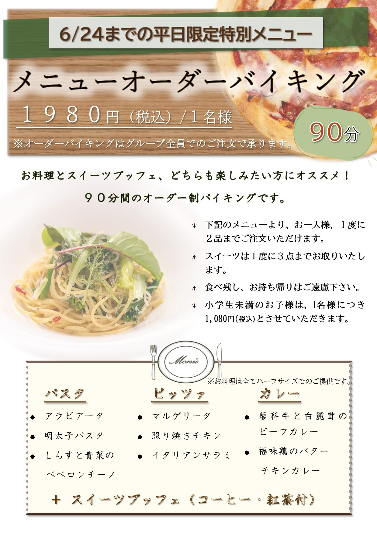 6/24までの平日限定でメニューオーダーバイキング、始めます!!🍝🍕🍛🍰✨
