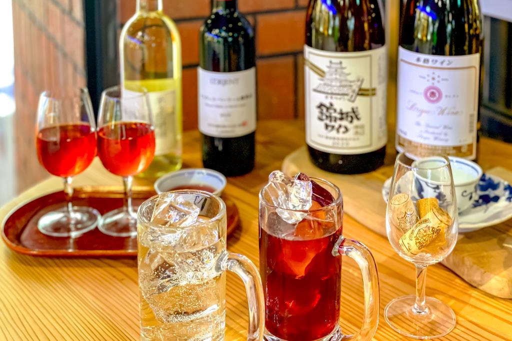 信玄鶏や甲州ワインビーフ、富士桜ポークを使用したおつまみに山梨県産のワインや自社農園のフルーツを使用したドリンクを楽しむことができる。