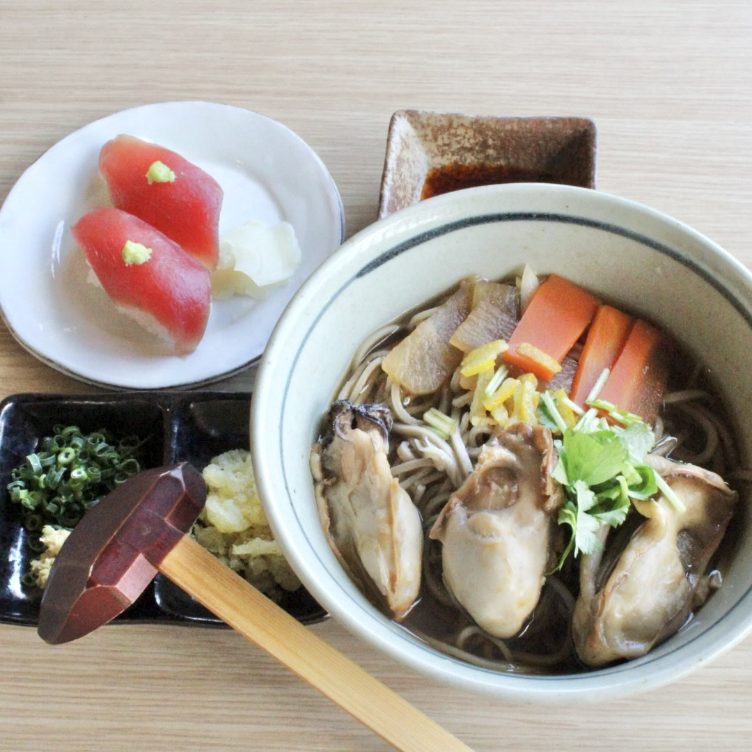 大粒の牡蠣が贅沢にのっている温蕎麦です🦪