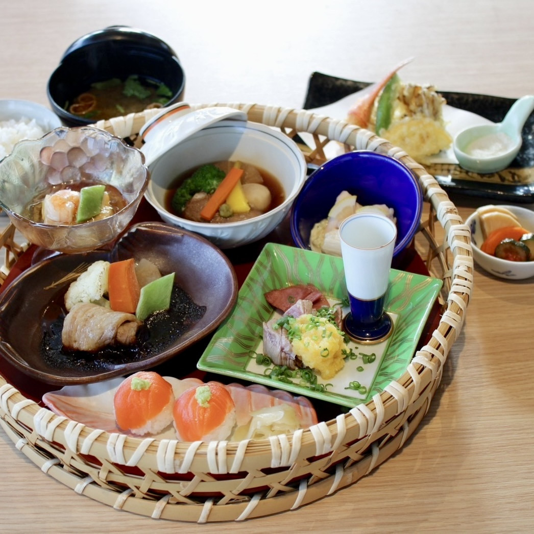 今月の花籠御膳のご案内です。 《内容》 信玄鶏・湯葉・山葵漬けソース 鮟肝煮・長芋味噌漬け・海老 鮪中とろたたき・黄身おろし 富士桜ポークエリンギ巻き 鮪ホホ肉・大根・里芋 甲斐サー...
