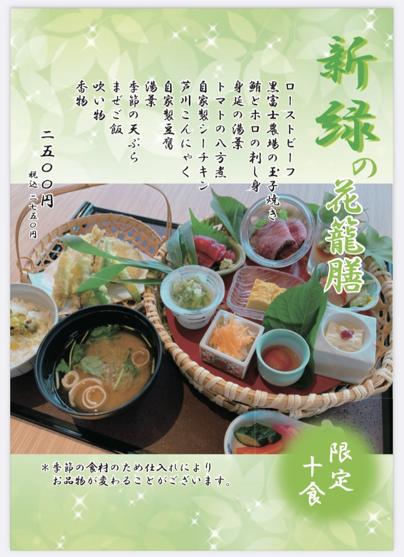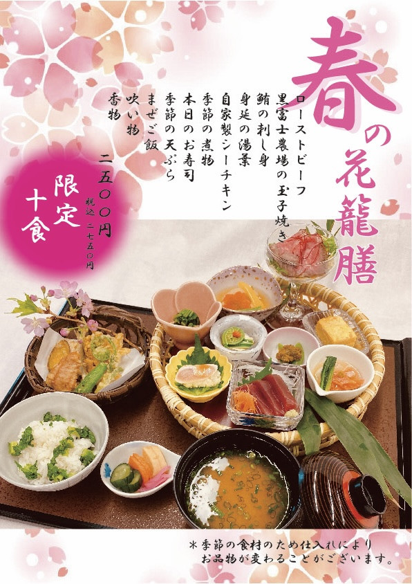 春のメニュー「花籠御膳」ができました。 春の食材をたっぷり使い彩とりどりに仕上げました。限定10食ですのでお早めにご注文ください。
