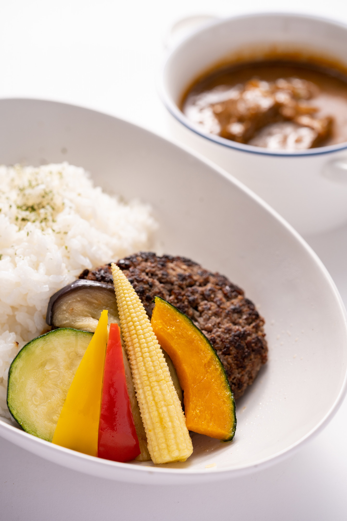 黒毛和牛を使用したハンバーグと、人気のカレーライスがセットに。大人が食べても十分に満足できるセットです。 お子様連れでもお気軽にいらしてください。