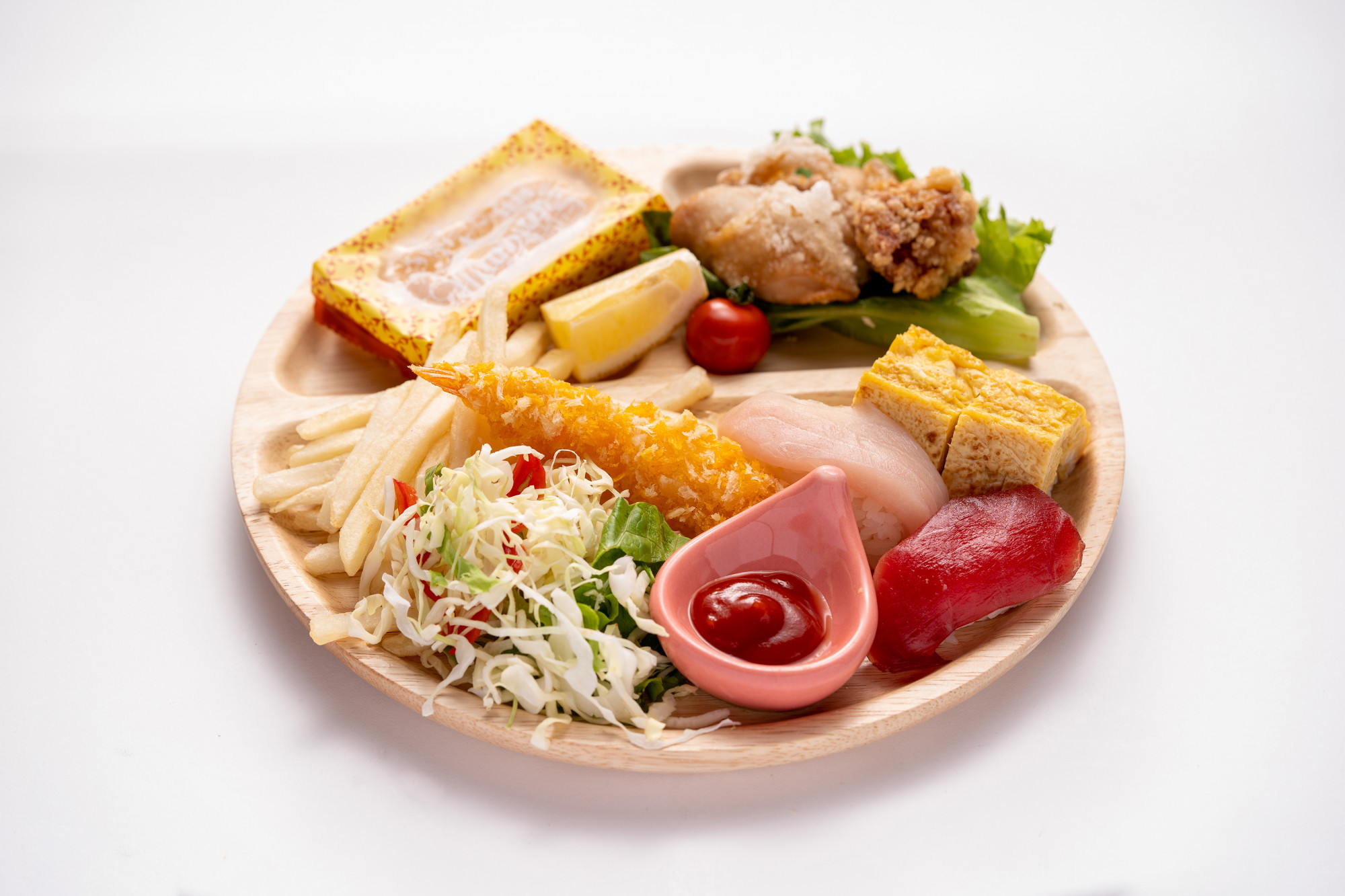 こちらのお子様メニューはいろいろ楽しめるプレートです。人気のエビフライ・唐揚げ・お寿司がそろったスペシャルなお子様メニューです。 小さなお子様連れでもお気軽にお越しください。