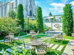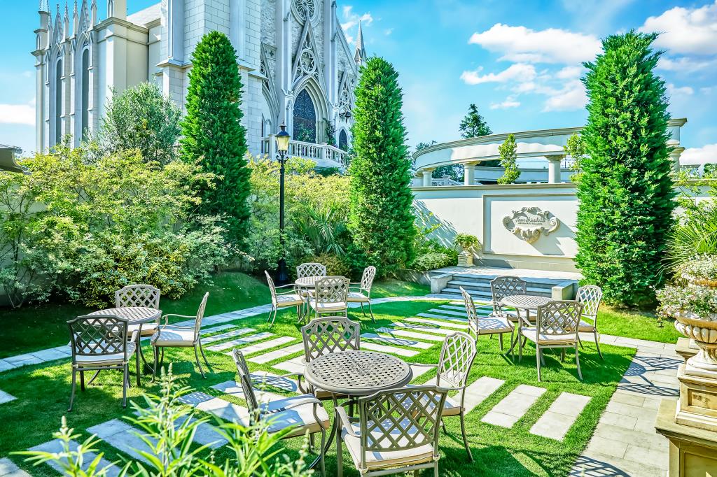 開放的で緑豊かなイングリッシュガーデンのテラス席。晴れた日は青空と緑の美しいコントラストも…