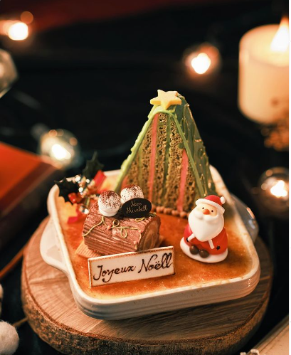 ミラベル特製クレームブリュレを土台に、ピスタチオと木苺のオペラでできたクリスマスツリー、珈琲とショコラのブッシュドノエルと3種類の味わいを贅沢にお楽しみいただける一品です!!!🤤お洒落なグラタン皿もついてきちゃいます😳✨