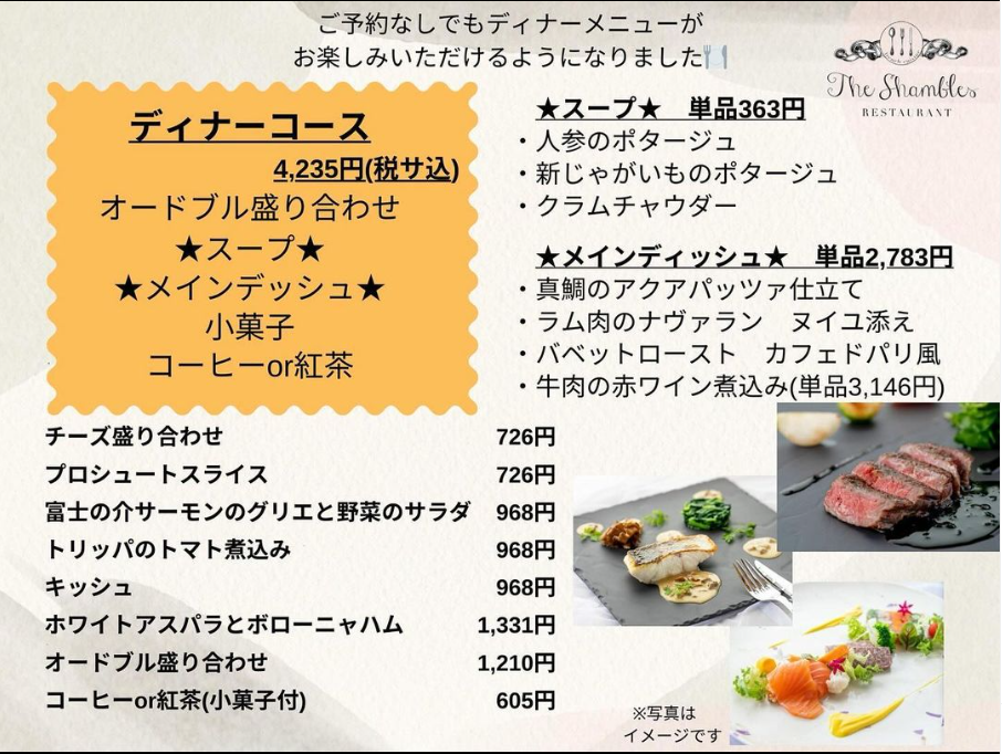 ディナー(ハーフコース)もご予約なしで お越しいただけるようになりました𓌉𓇋 🤍 ̖́- メニューは変わっていきますので要チェックです︎︎︎︎☑︎ 引き続き レストラン・ザ・シャンブルズ... -
