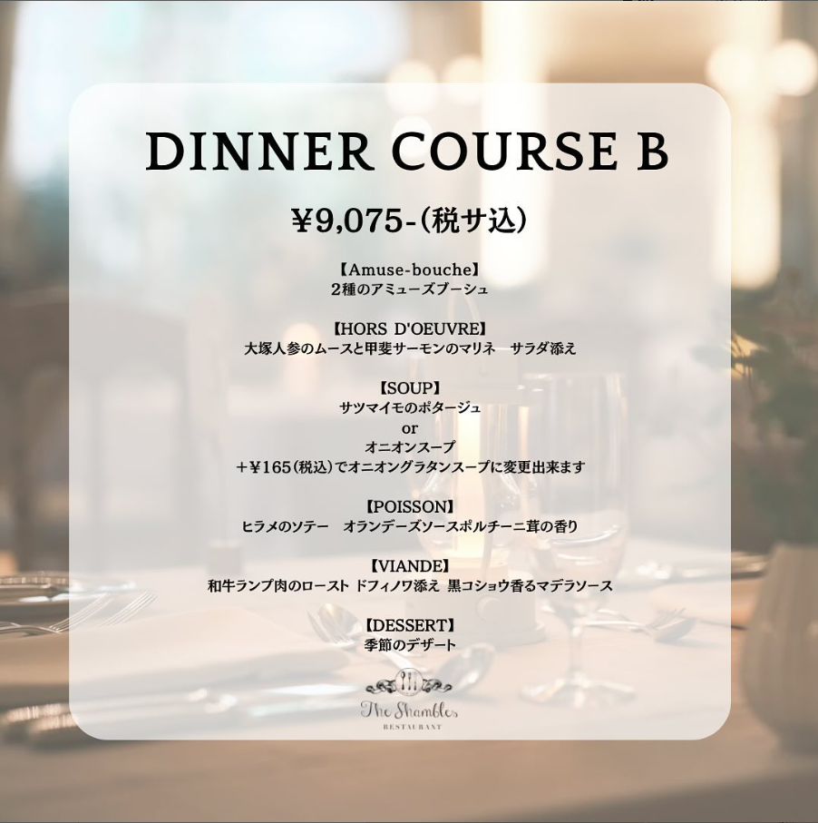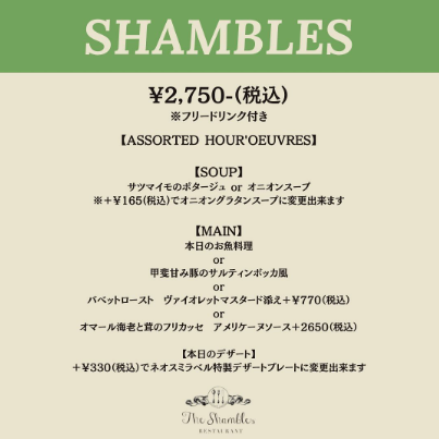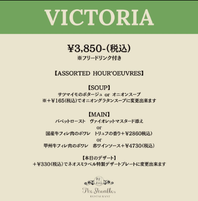 ●ランチメニュー <CASUAL LUNCH> ・カジュアルランチセット 1,980円 <SHAMBLES> ・ハーフコースランチ 2,750円 <VICTORIA> ・フルコースランチ 3,850円 ※いずれもフリードリンク付き ●ディナーコース ・Dinner A 6,050円 ・Dinner B 9,075円 ※パン・コーヒーまたは紅茶付き ・記念日プラン 9,900円(1名) ・お顔合わせプラン(個室対応) 16,500円(1名) ※3日前の15時に予約締切 ・プロポーズプラン 23,100円(2名) ※14日前の15時に予約締切 |