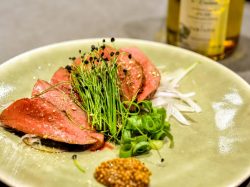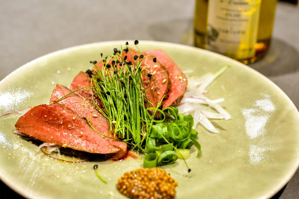 ・トリュフ塩でたべる牛ハツのタタキ 880円