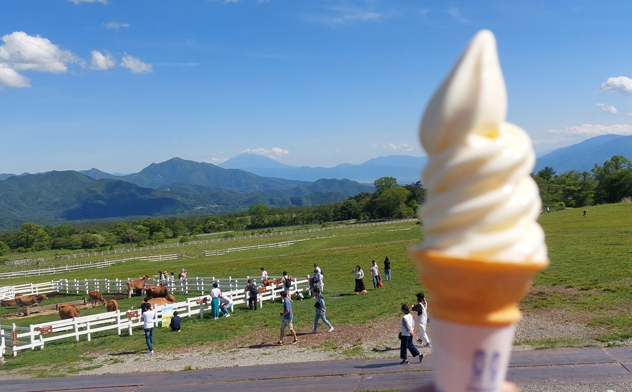 あいにく前日の雨で富士山は雲がかかってましたが、ジャージー牛を見ながらのアイスは最高🎵