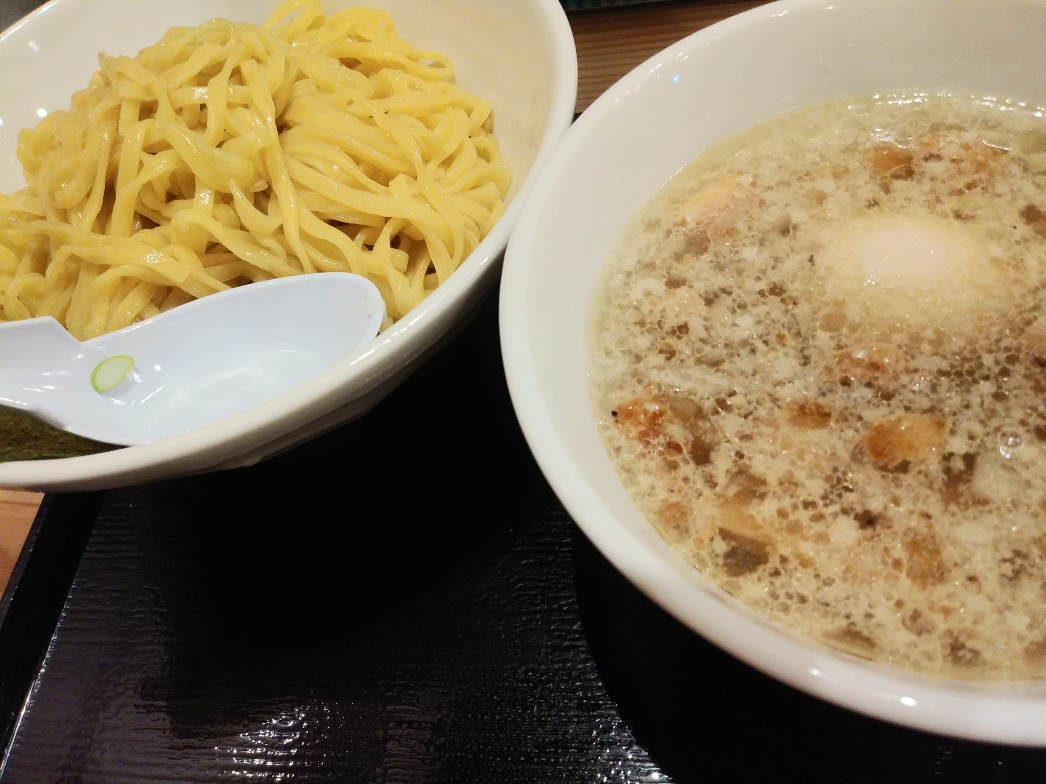 シンプルなラーメン、塩ラーメン、つけそば、塩つけそばとメニューは少ないので、食券で買う時に選びやすかったです。ラーメン屋さんにしては珍しくセルフサービス。新鮮な葱も、セルフで好みの量をトッピングします。塩つけそばに味玉をトッピングしました。ラーメンは細麺、つけそばは少し太めのちぢれ麺でした。もちもちした食感で、非常に美味しい麺でした。つけ汁にはメンマと四角にカットされたチャーシュー入り。チャーシューは脂もあるのですが、肉肉しい美味しいチャーシューでした。つけ汁が、チャーシューの脂とは別の、少し油っぽさを感じました。味玉は、今まで食べて来たラーメン屋さんの中でも、私の中では上位に入ると思いました。半熟加減、味の染み込み方、非常に美味しかったです。麺の量が1玉1.5玉2玉と同一料金でお得でした。