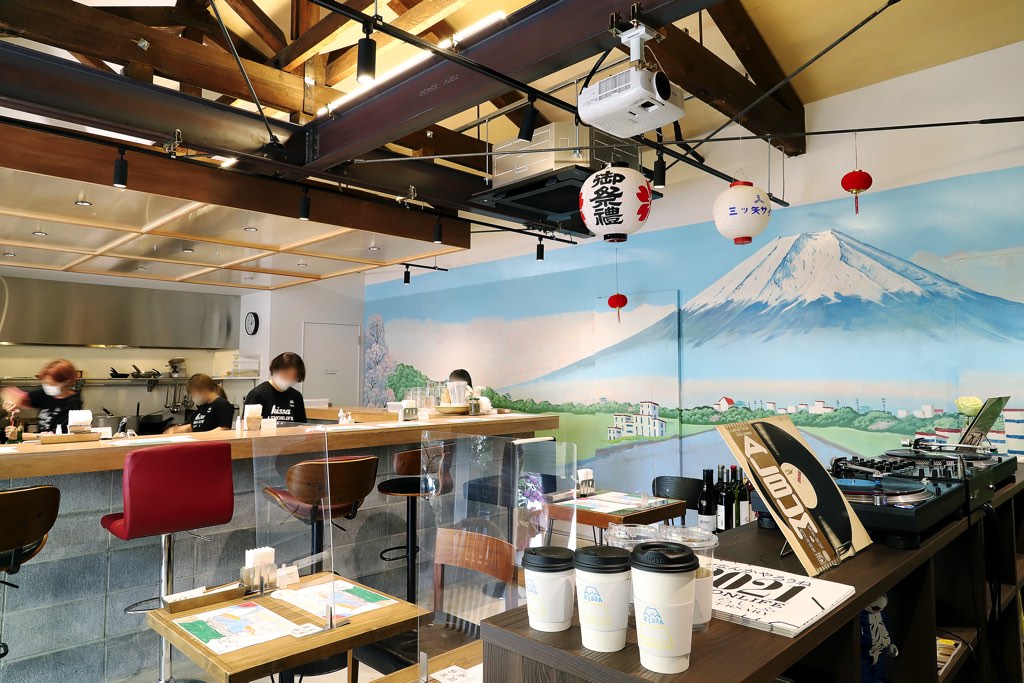 富士吉田市本町通り沿い、空店舗をリノベージョンしたユニークなカフェ「喫茶檸檬」。入口を入ると目の前の壁一面には銭湯をイメージした雄大な富士山が描かれている。