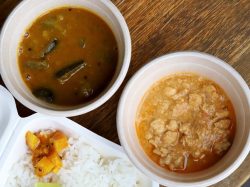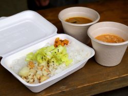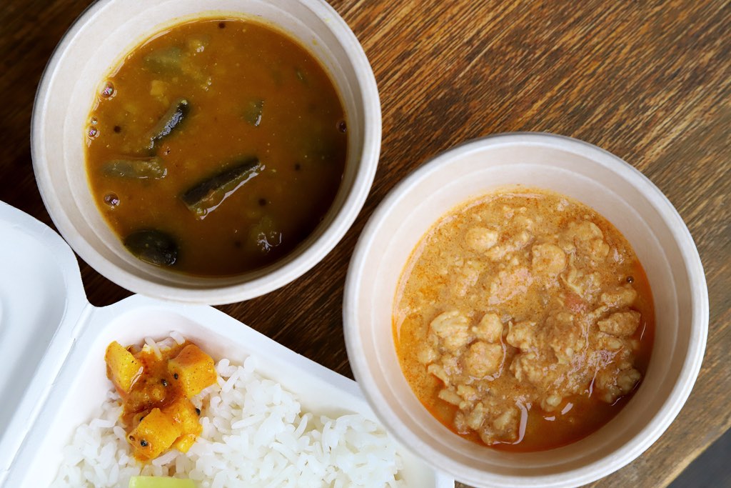 手づくりにこだわり、スパイスが香る本場カレー弁当は、ベジ、ノンベジ、ベジ&ノンベジの3種類で、内容は週替わりで楽しめる。すべてお惣菜2種とライス付きでボリューム満点!