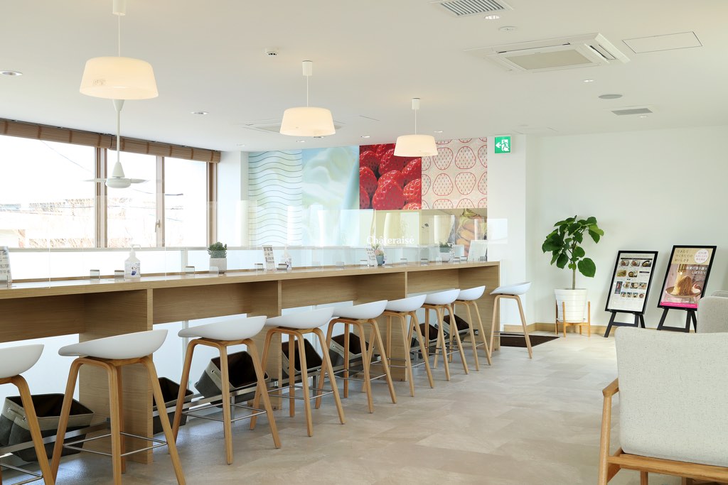 シャトレーゼの愛すべきロングセラーや新商品をはじめ、つくりたて工房の“焼きたて、できたて”の美味しさを2階のカフェですぐに楽しめる。