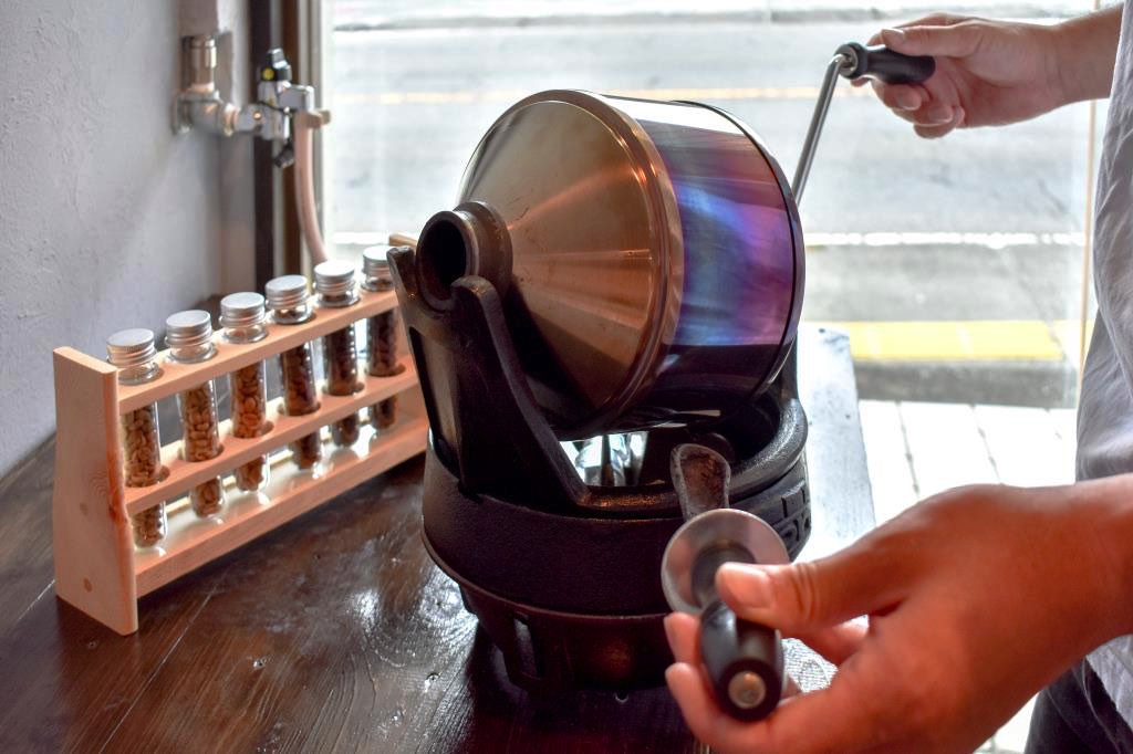 ハンドドリップコーヒーのテイクアウトや自家焙煎豆の販売、土日限定予約制で焙煎体験を行っている。オーナーの淹れるコーヒーは深煎りの“熟成”させた味わいが楽しめるのが特徴。気候や湿度によっても変化する味の違いを楽しんでほしい。