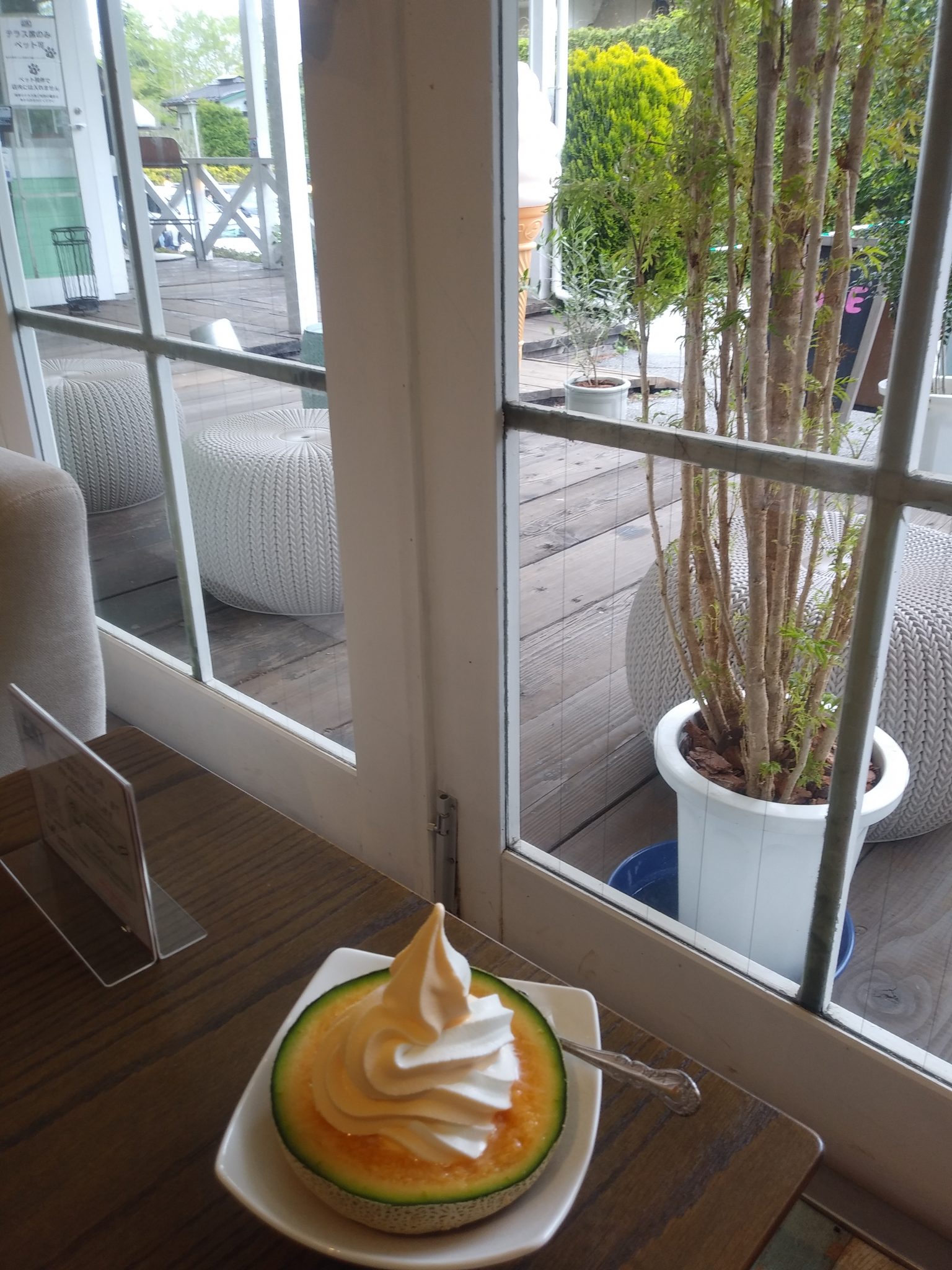暑くなってくると、爽やかな気候の中過ごせるお店が素敵です。メロンソフトクリームを頂いてみました。ソフトクリームはメロンとバニラのミックスです。ソフトクリームが甘いのですが、メロンもよく熟れていて負けない甘さがありました。真夏に利用したいお店です。