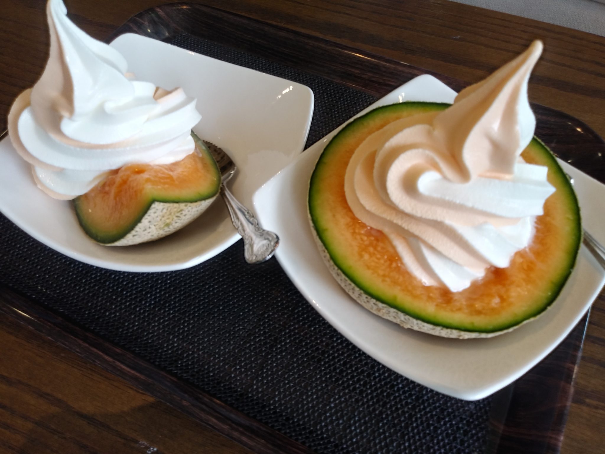 暑過ぎるので、避暑地へ出掛けて来ました。甘~いメロンとソフトクリーム、看板メニューの「サンタのヒゲ」です。大と小がありました。メロンもソフトクリームも甘くて美味しかったですし、周りの環境も良かったです。パフェも美味しそうだったので、次は食べてみたいです。