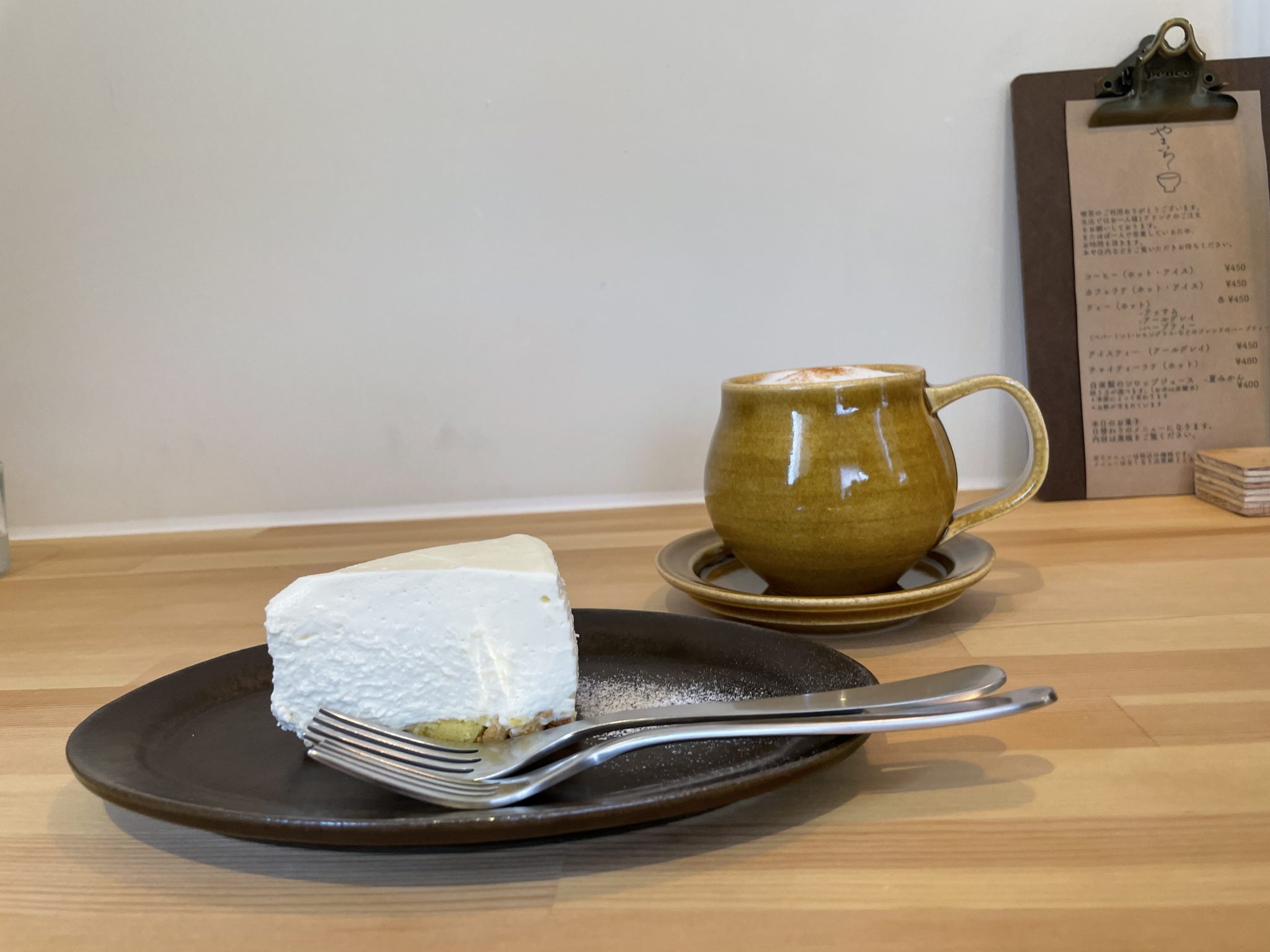 ・コーヒー(ホットorアイス) 550円 ・カフェラテ(ホットorアイス) 550円 ・チャイティーラテ(ホット) 550円 ・ホワイトソーストースト 550円 ・バターとジャムトースト 500円 ・ケーキ各種 550円~ ※ワンドリンク制 |