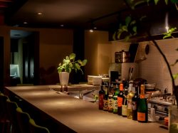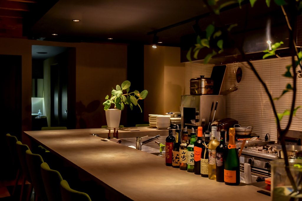 店内に入ると大きく開かれたカウンターと厨房が印象的。一段低く設置された厨房は「料理する過程も楽しんで欲しいとの事から生まれた拘りの店内。