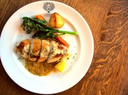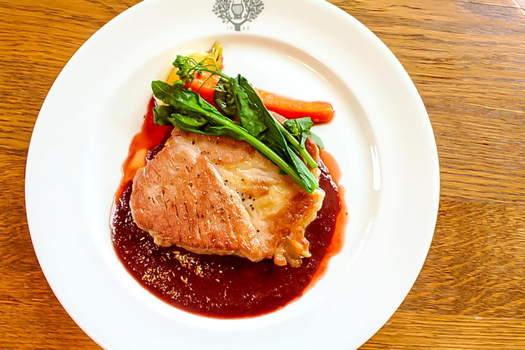 カリッと焼き上げた豚肉にマスタードの辛味と香りをすこし効かせた甘いソースと合わせ…
