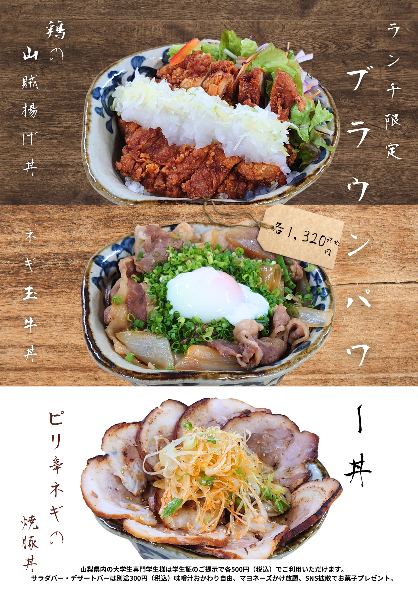 ランチ限定の「ブラウンパワー丼」 ・鶏の山賊揚げ丼 ・ネギ玉牛丼 ・ピリ辛ネギの焼豚丼   ※サラダバー・ドリンクバー・デザートバー付    【金額】各1,320円(税込) ...