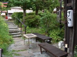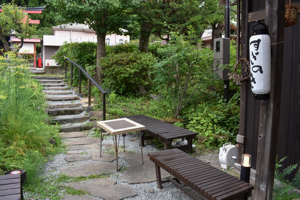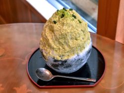 富士河口湖町、河口浅間神社の参道沿い、一本の杉の木で建てられた古民家を改装した風情のある佇まいのかき氷屋さん。