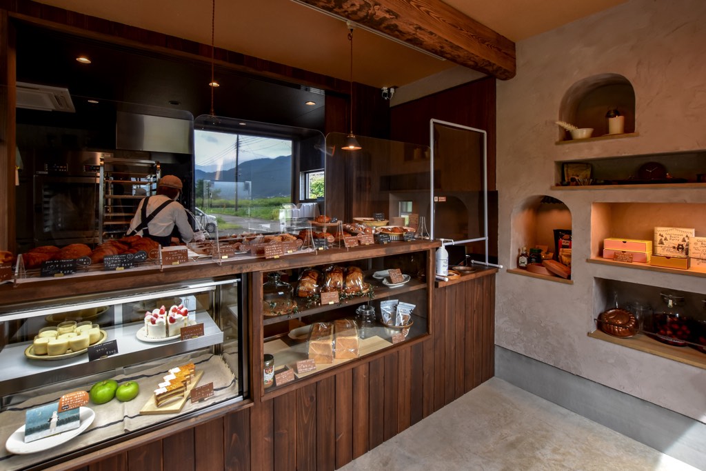 富士河口湖町、自然に囲まれた大石プチペンション村に店を構えるお菓子屋さん。焼菓子や洋菓子、パンが棚に並ぶ。