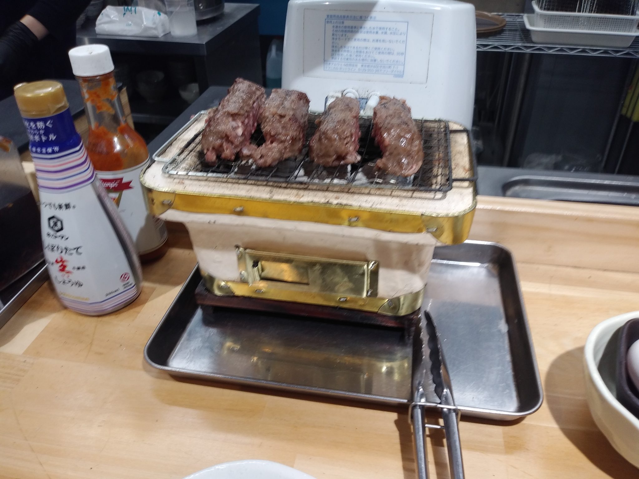 メニューが1種類しかなく悩まなくて良いです。カウンター席のみですが、回転は早いと思います。ハンバーグは、5割レアの状態で提供され、好みで卓上七輪で焼いていきます。調味料は豊富にありましたが、ゆず胡椒が1番合うと思いました。レアだとハンバーグと言うより、ユッケのようでした。よく焼いて和風のハンバーグソースで頂くのが良いと思います。ご飯、味噌汁はお代わり自由が嬉しいです。武川米に、甲州味噌使用で、どちらも美味しかったです。煙で臭いが強い所はお気をつけくださいね。