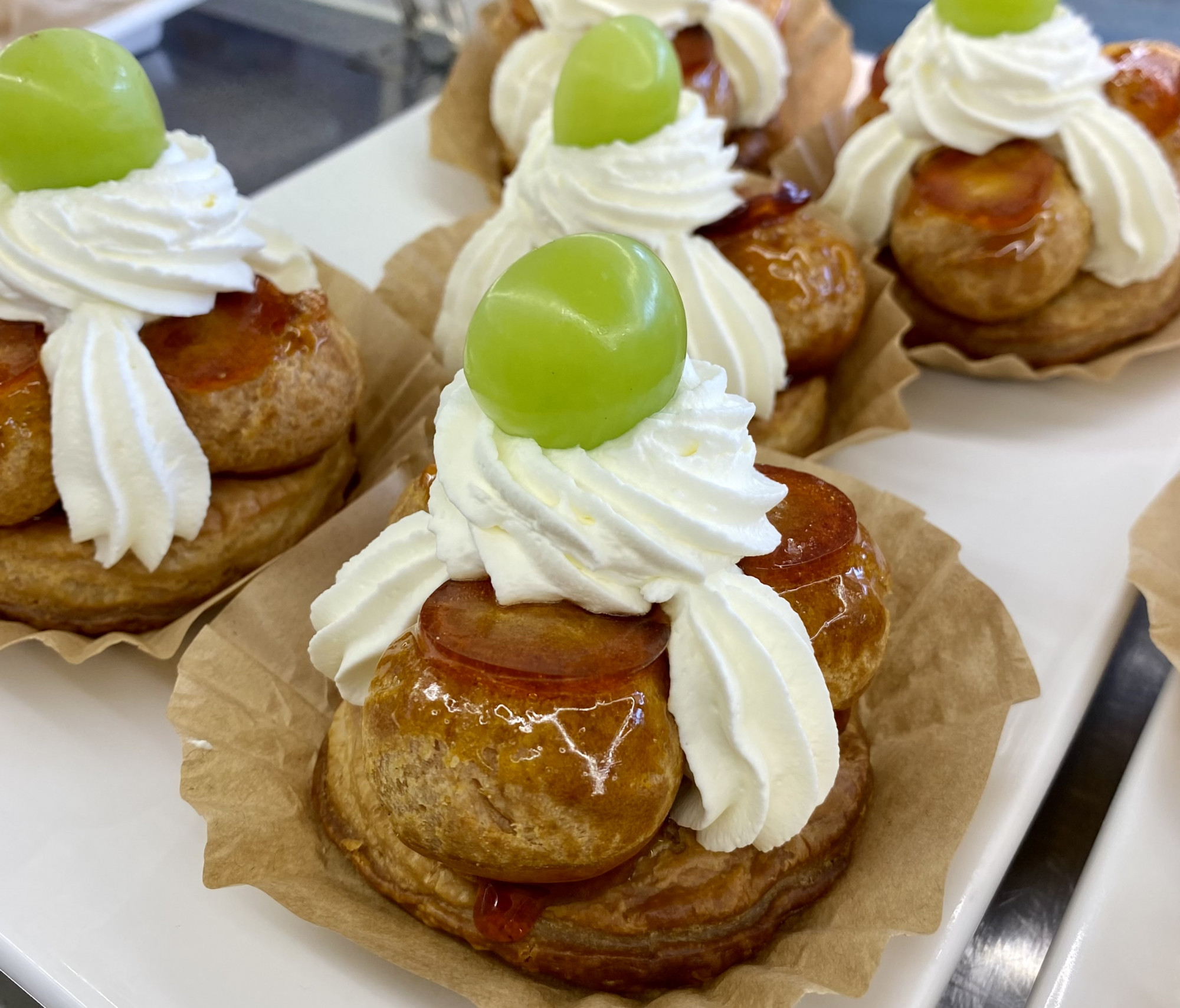 新作サントノレのご紹介です。パイ生地とシュー生地の2種類の生地をキャラメルで接着し、2種類のクリームを使った、複雑な味わいと食感のお菓子です。 当店では更に旬のシャインマスカットをあしらいました。 ... -