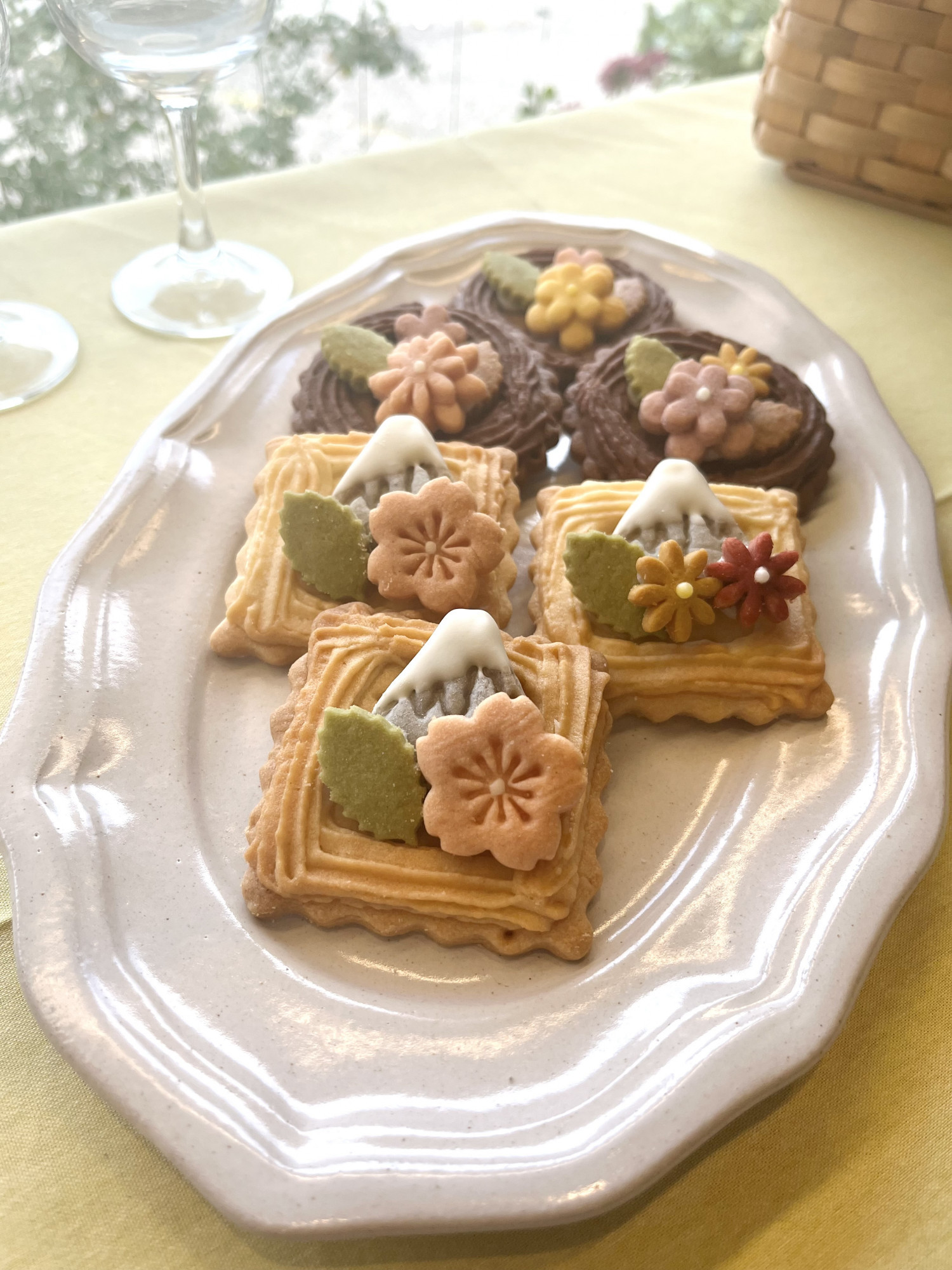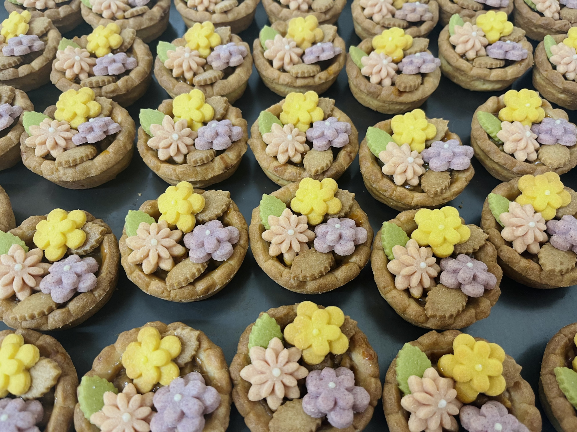 やわらかめのクッキー生地にクルミヌガーを敷き詰めたベースに、鮮やかに色づいたお花のクッキーが咲き誇ります。