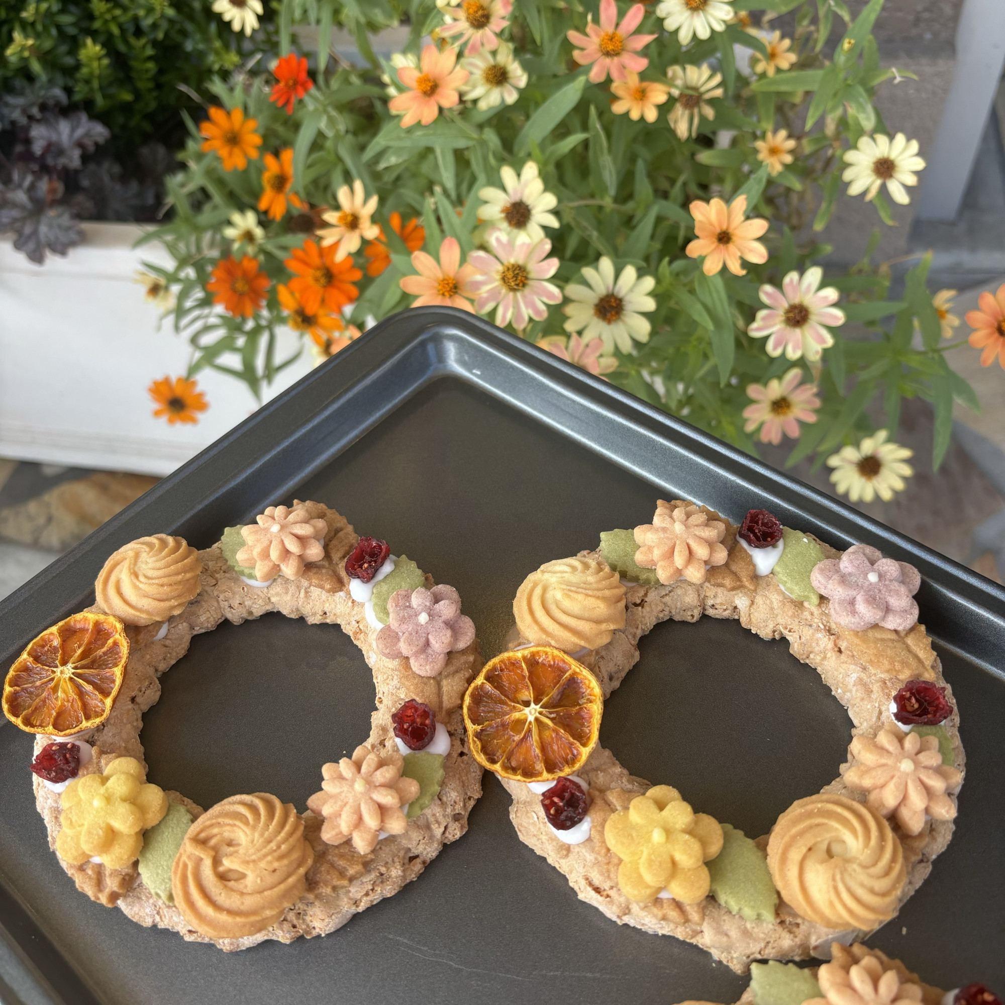 本日もお花のお菓子や焼きたてのお菓子をたくさんご用意しております。 クッキーリースにお写真やメッセージをお入れして、世界で一つだけのギフトをお作りします。 19時まで元気に営業いたします。... -