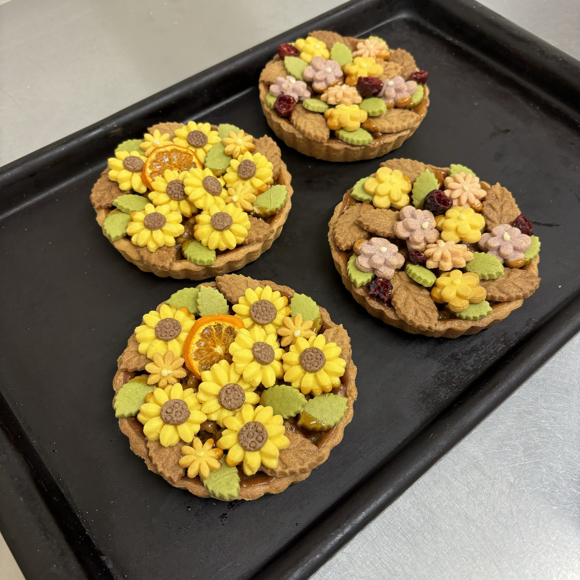 元気いっぱいに咲くひまわりを、くるみがたっぷりのタルトにのせております。