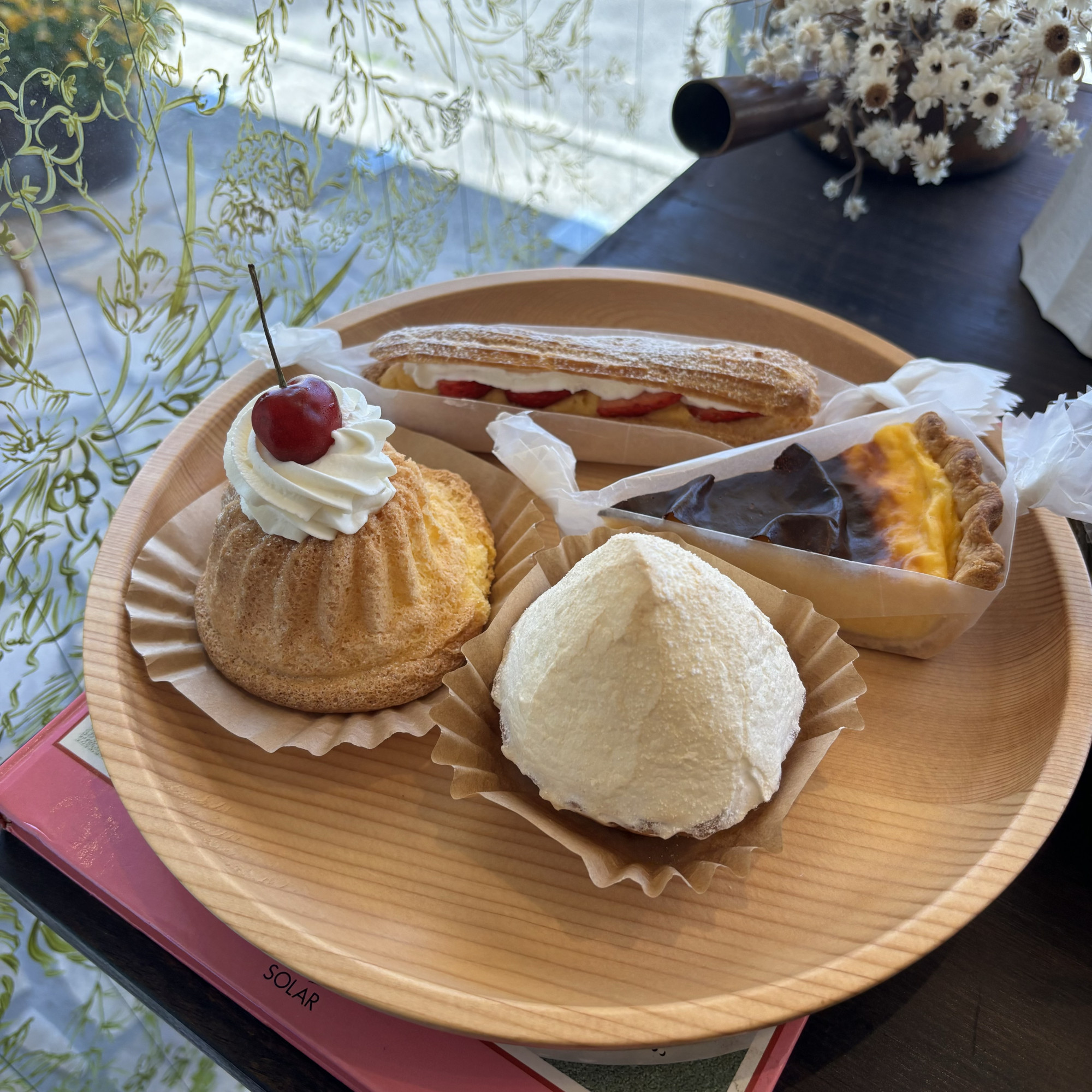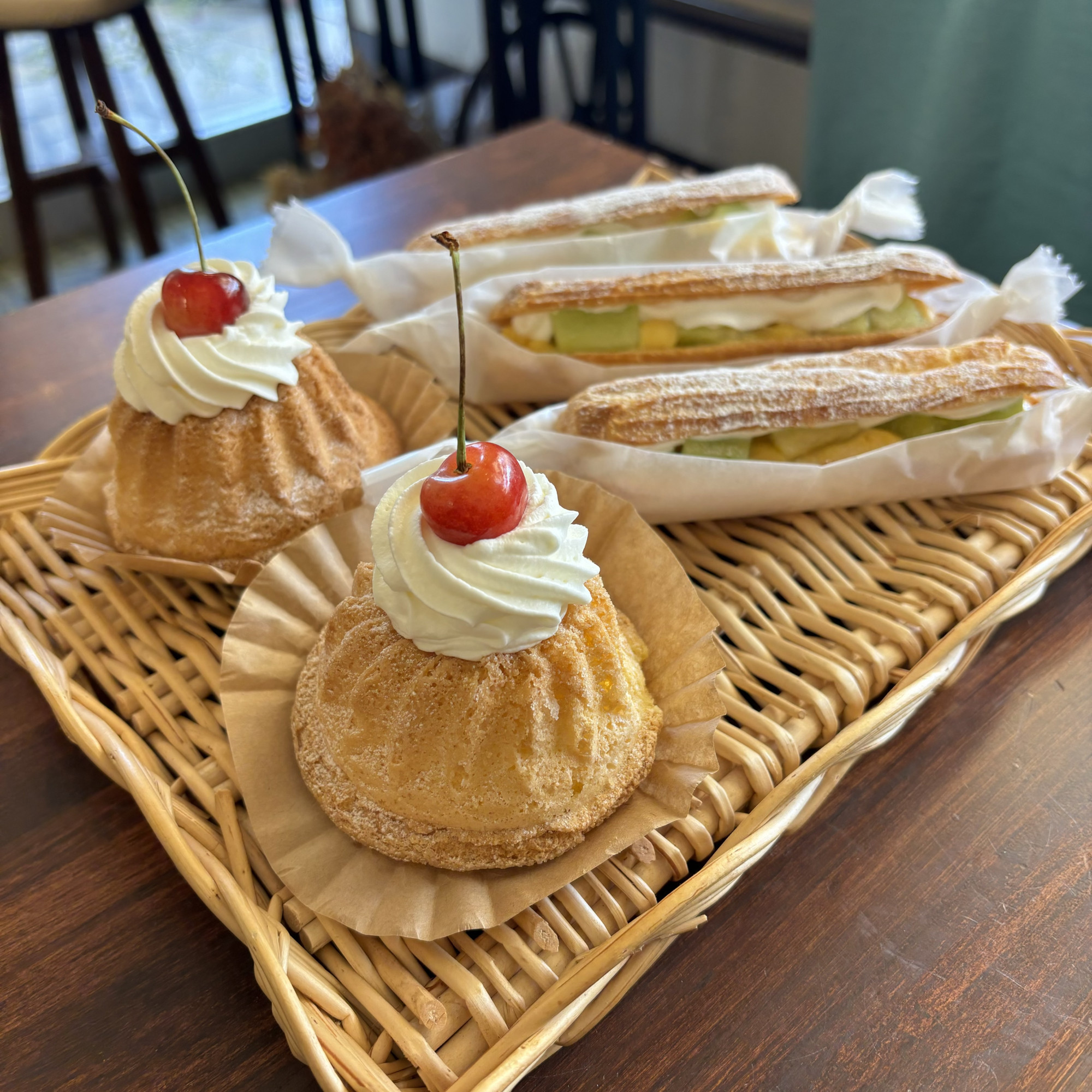 当店ではお馴染みのフラン、チェリーを使ったフルーツのサヴォア、爽やかなタルト・オ・シトロン、苺のエクレールをご用意しております。